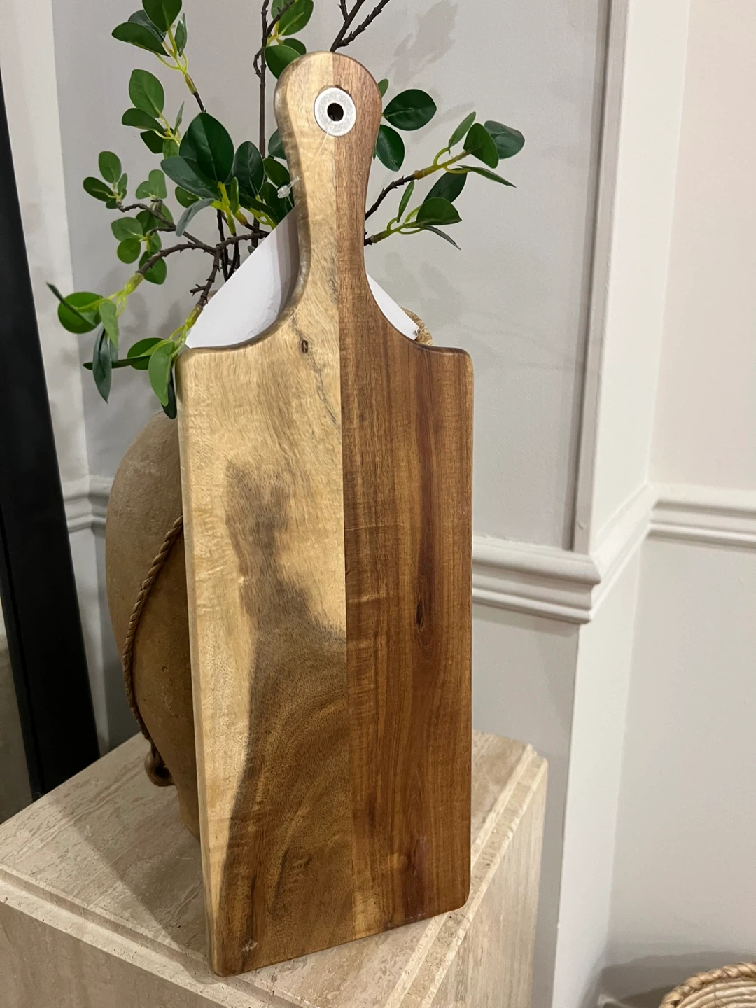 Here's a lovely acacia wood paddle serving board. It's perfect for serving cheese, charcuterie, or appetizers. It would look great in your kitchen!
