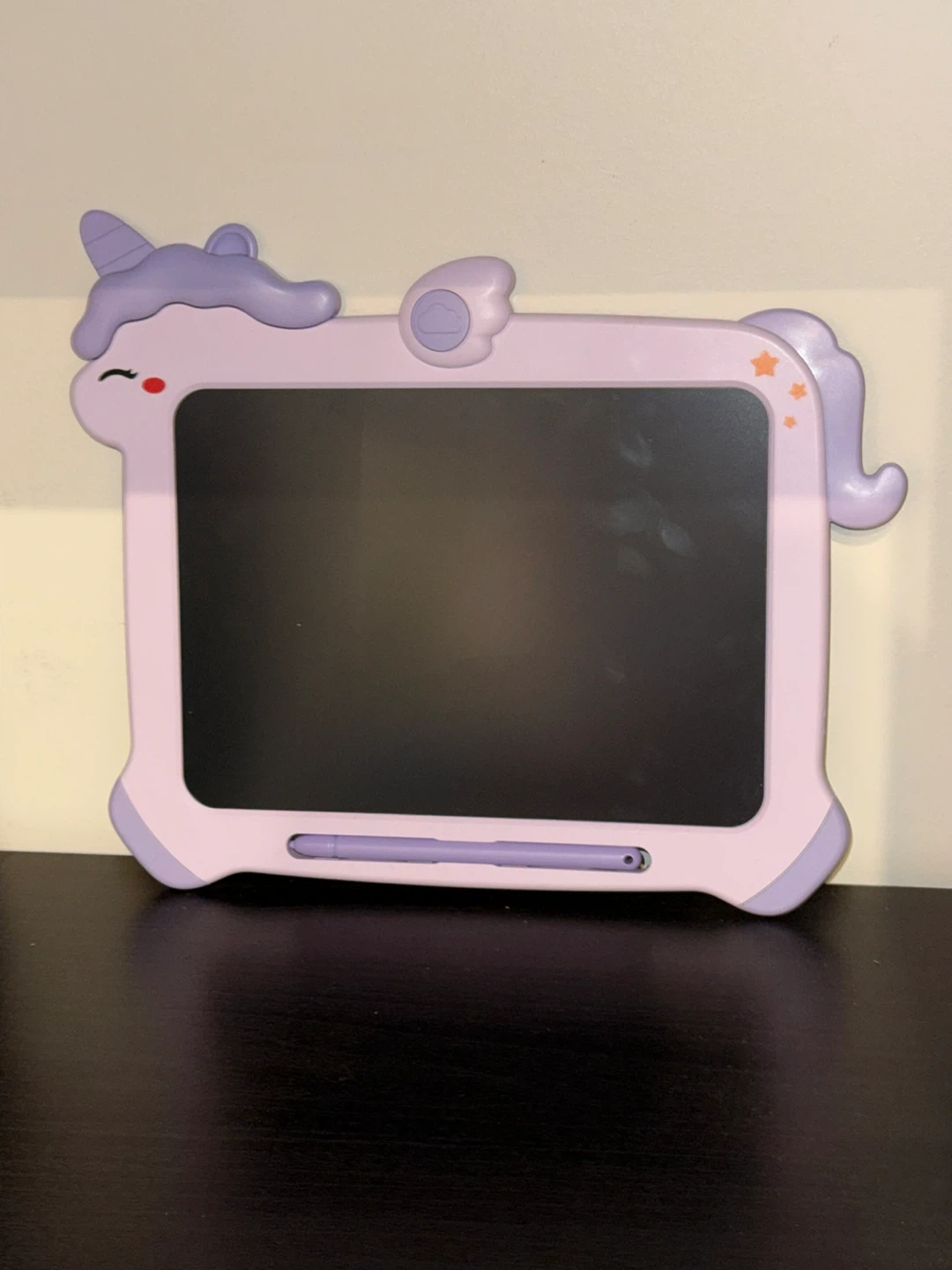 Here's a cute unicorn-themed LCD writing tablet! It's in great shape and ready for a new artist. Comes with a stylus for easy doodling and drawing. Perfect for keeping kids entertained on the go or at home.