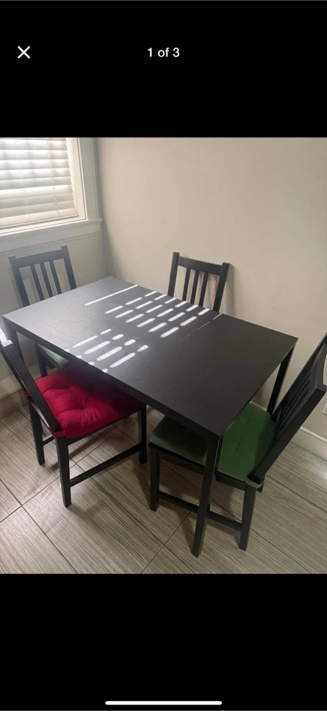 Selling a black dining table with four chairs. The chairs have different coloured cushions, one red and one green. Great for a small dining area or kitchen nook!