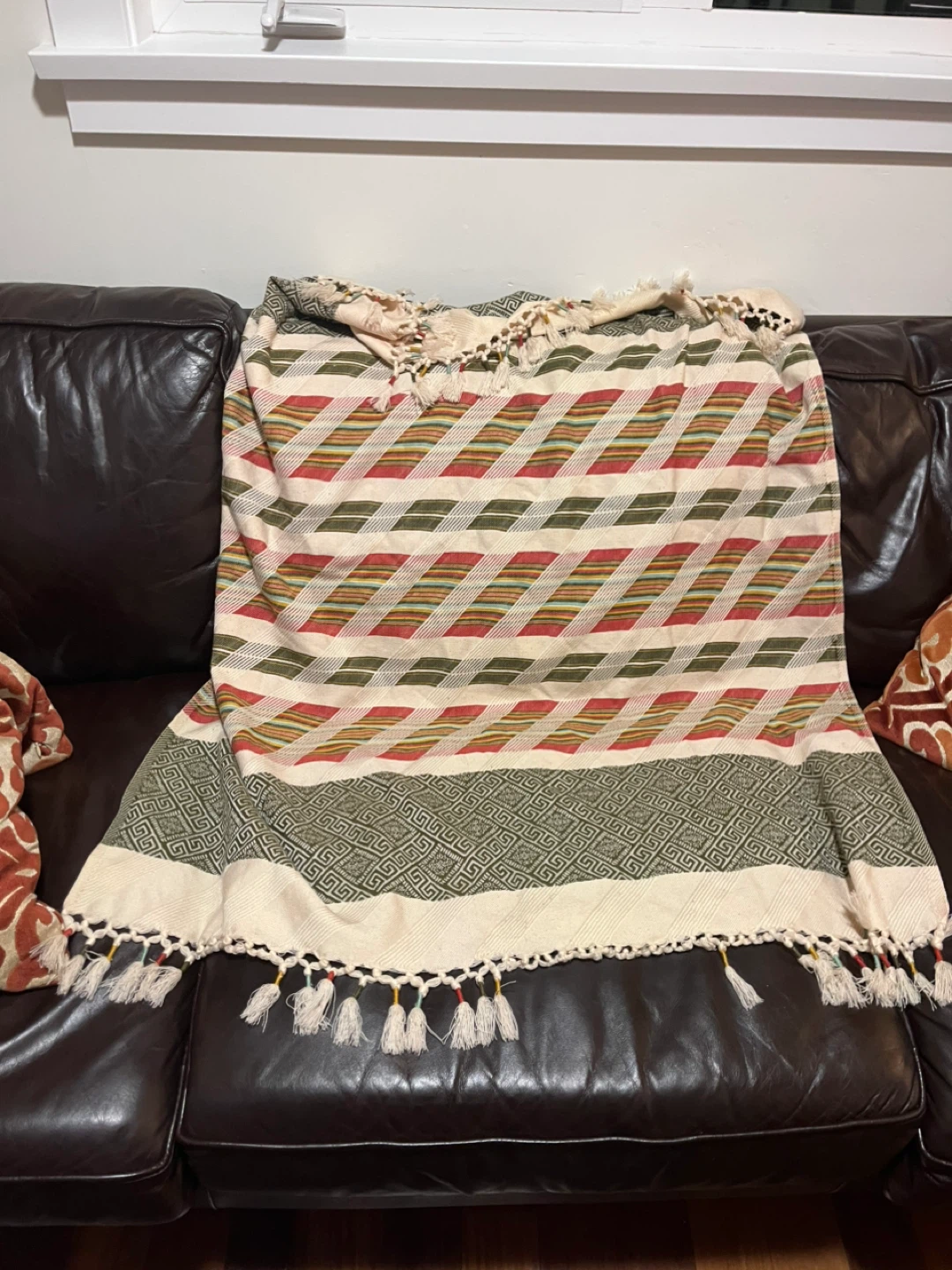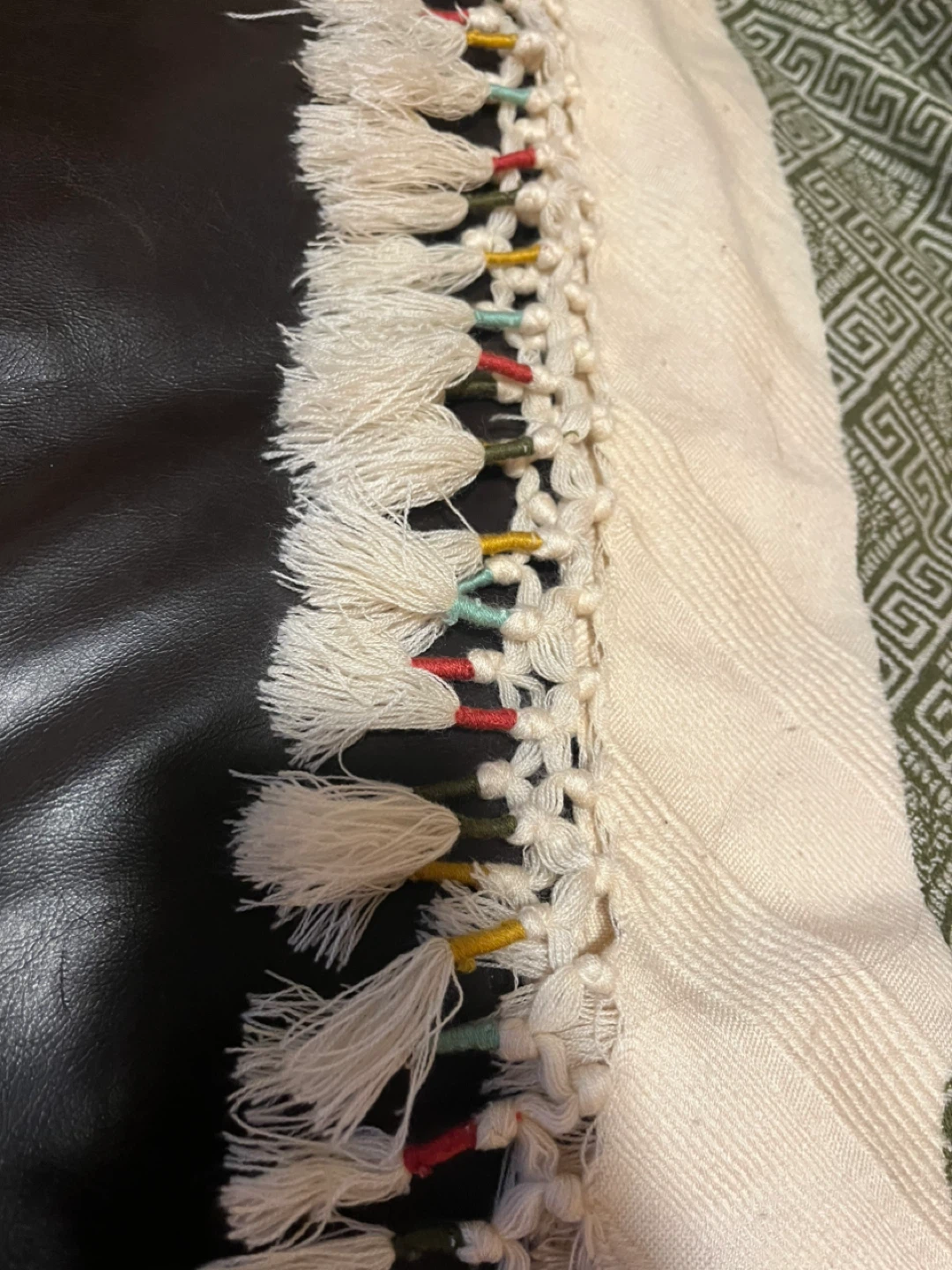 Lovely Hollister shawl or use it as a throw blanket like we did! It's made of 100% acrylic and has a lovely pattern with tassels that have a rainbow of knots.