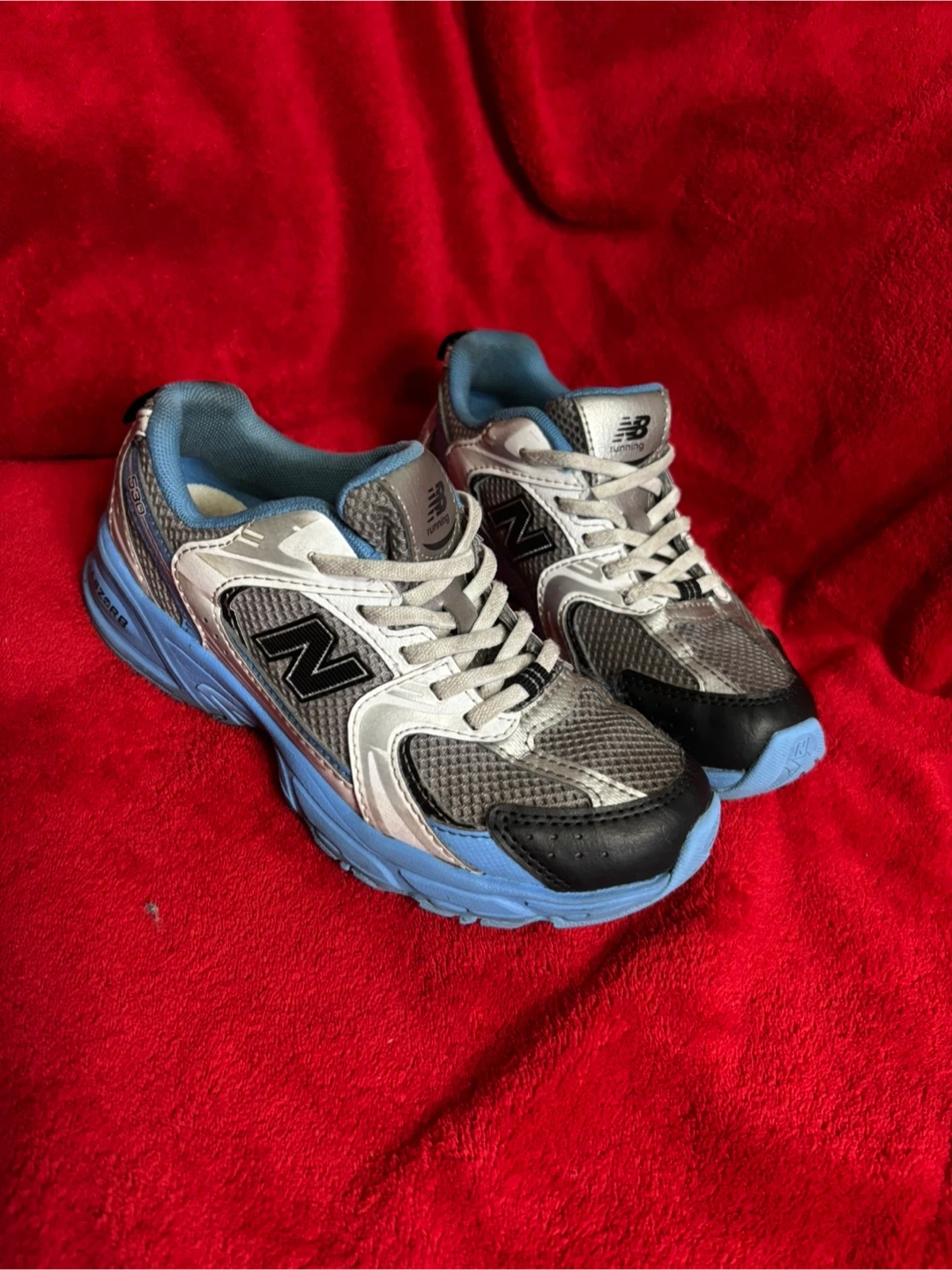 Selling a pair of New Balance 530 kids shoes. They're in great condition and perfect for everyday wear. The shoes feature a light blue, silver, and black color scheme. They're comfortable and stylish for your little one!