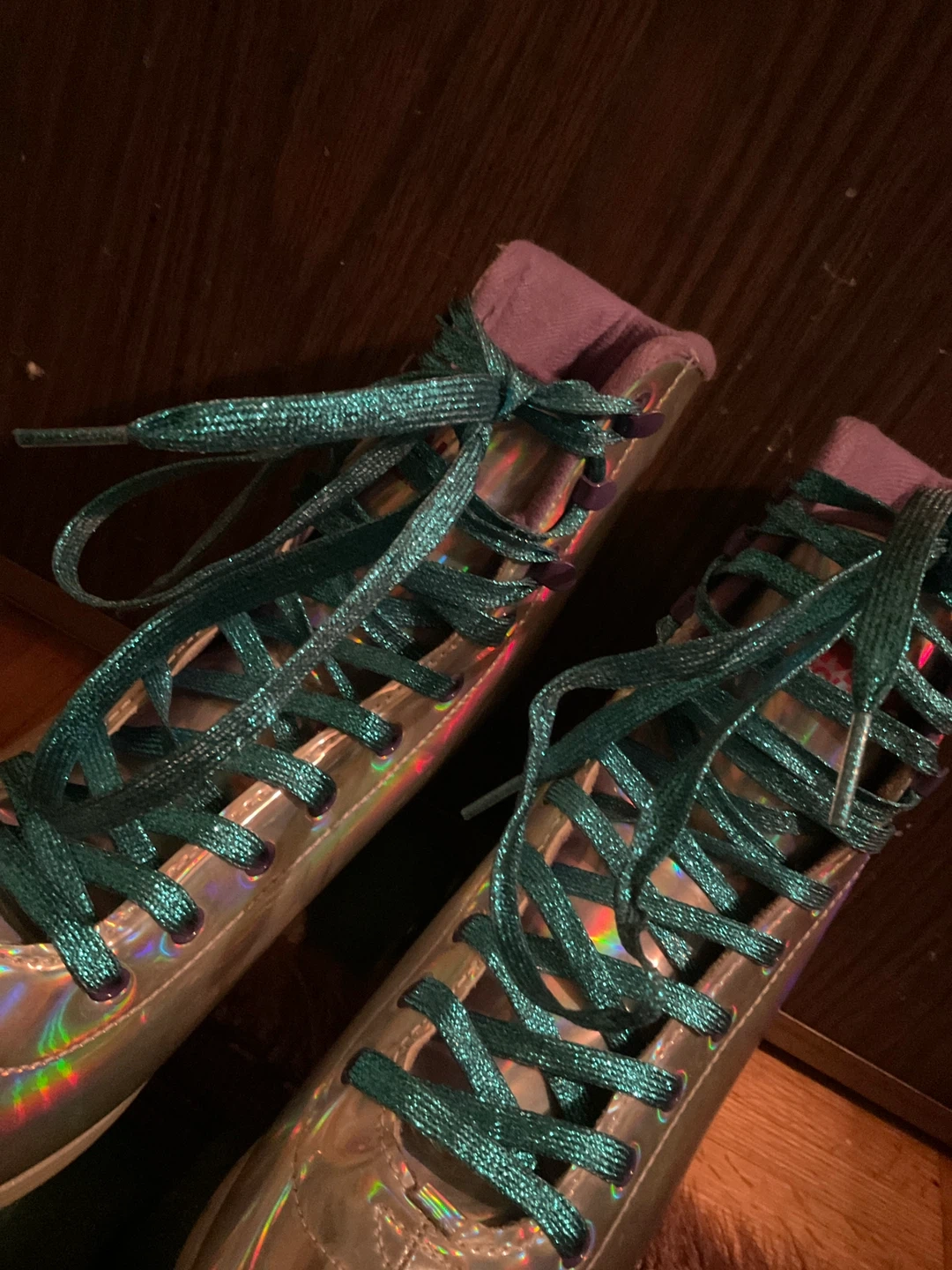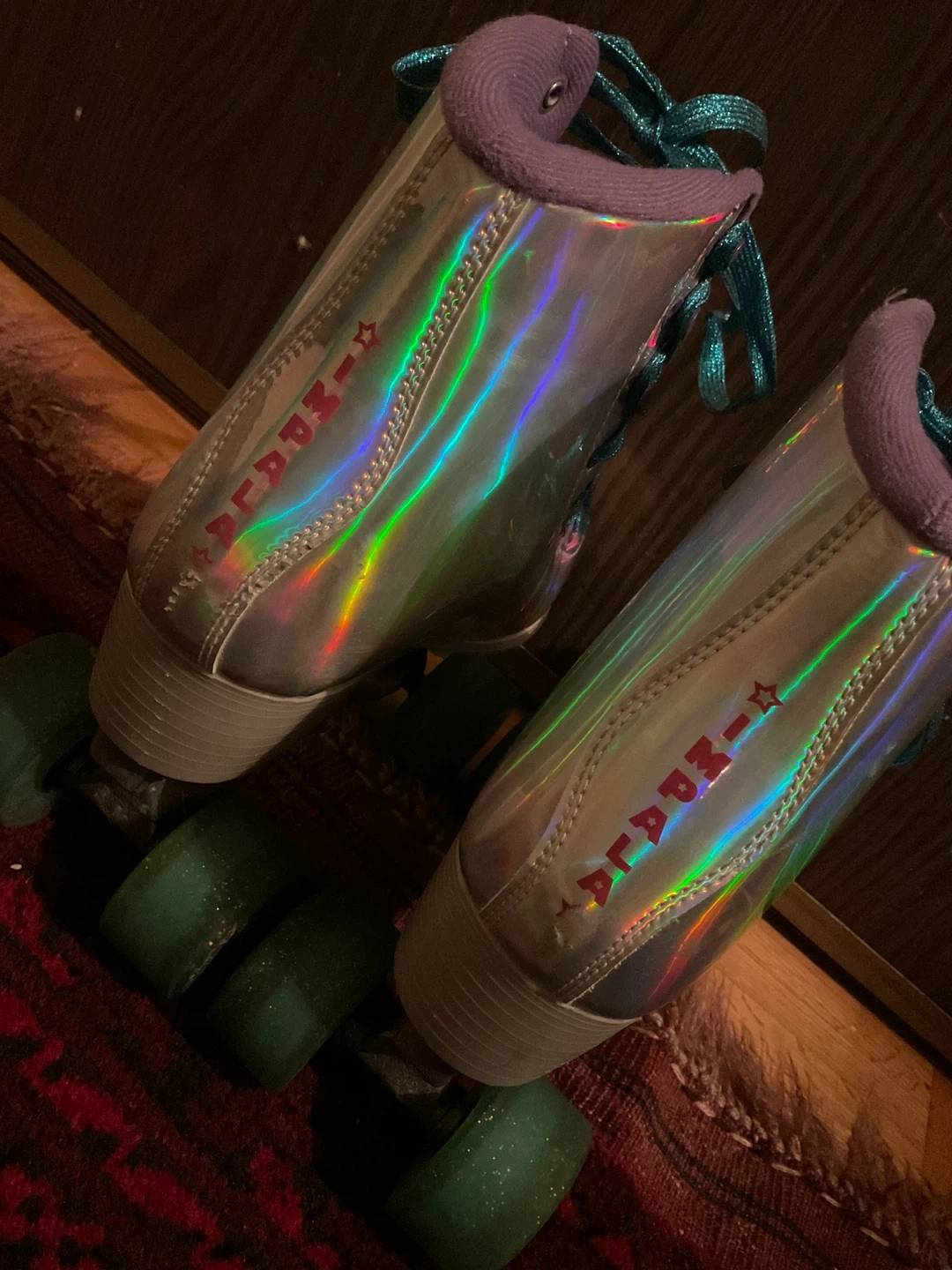 Selling a pair of Impala roller skates! They are in great condition and ready for some fun. The skates have a shiny, iridescent finish and green wheels and laces. They are size U.S 9 Women