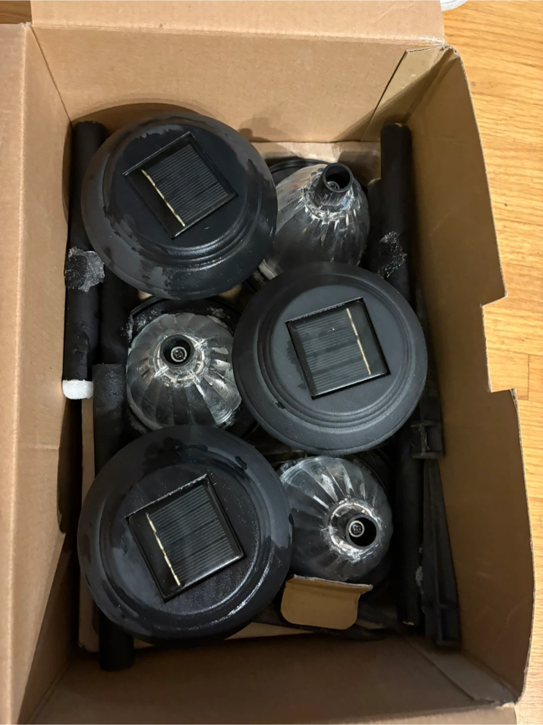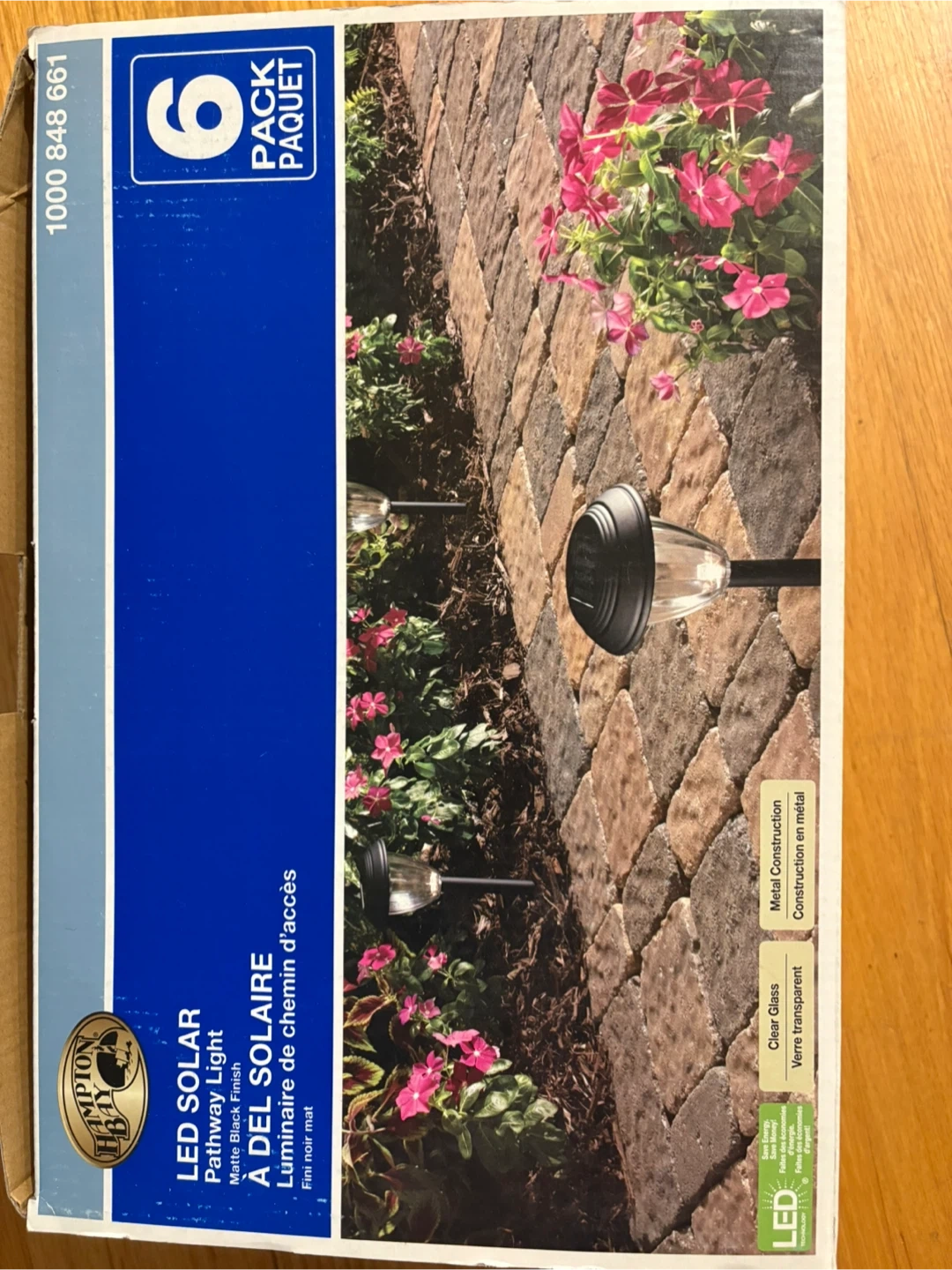 Selling a pack of 6 Hampton Bay LED solar pathway lights. They have a metal construction and clear glass. The box is included!