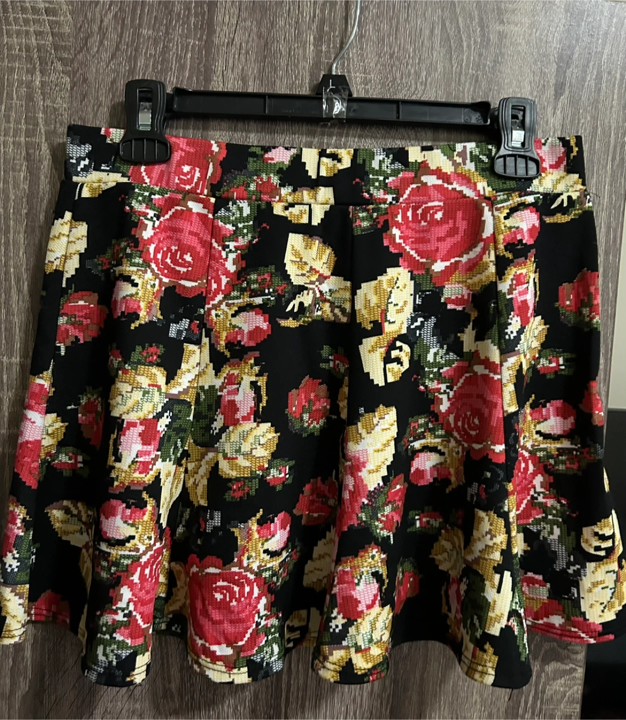 Selling a cute floral print skirt in size small! It features a black background with a vibrant rose pattern. The skirt is in great condition,like new, never used and ready for a new home. Perfect for adding a pop of colour to your wardrobe!