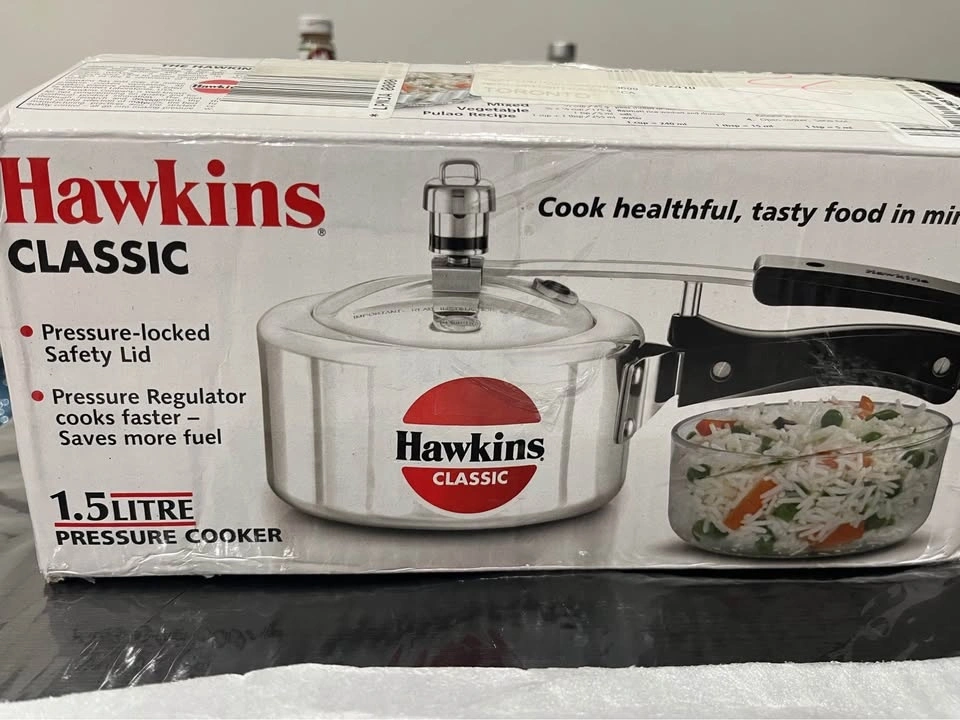 Selling a brand new Hawkins Classic 1.5 Litre Pressure Cooker. It is still in the original packaging and has never been used (stickers are still on the body).