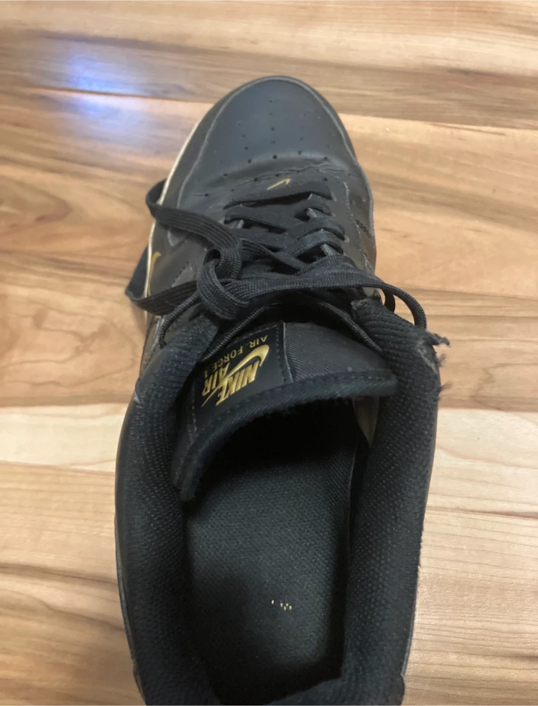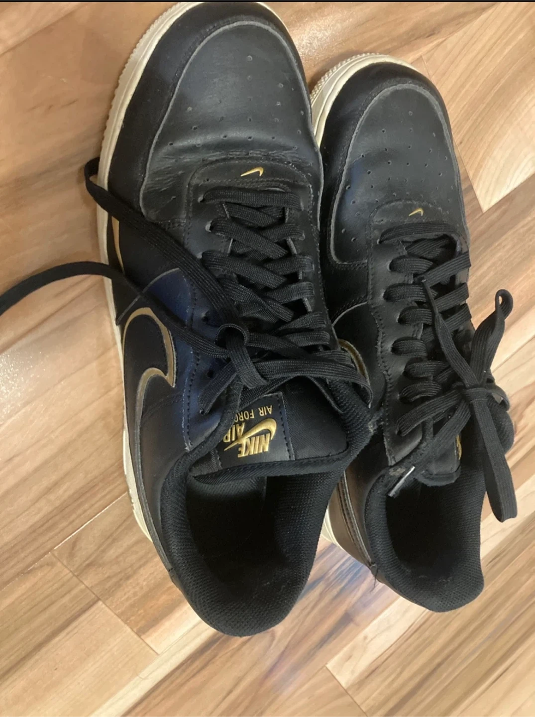 Selling a pair of Nike Air Force 1 sneakers in black with gold accents. They show some signs of wear, but still are great for gift or personal use!