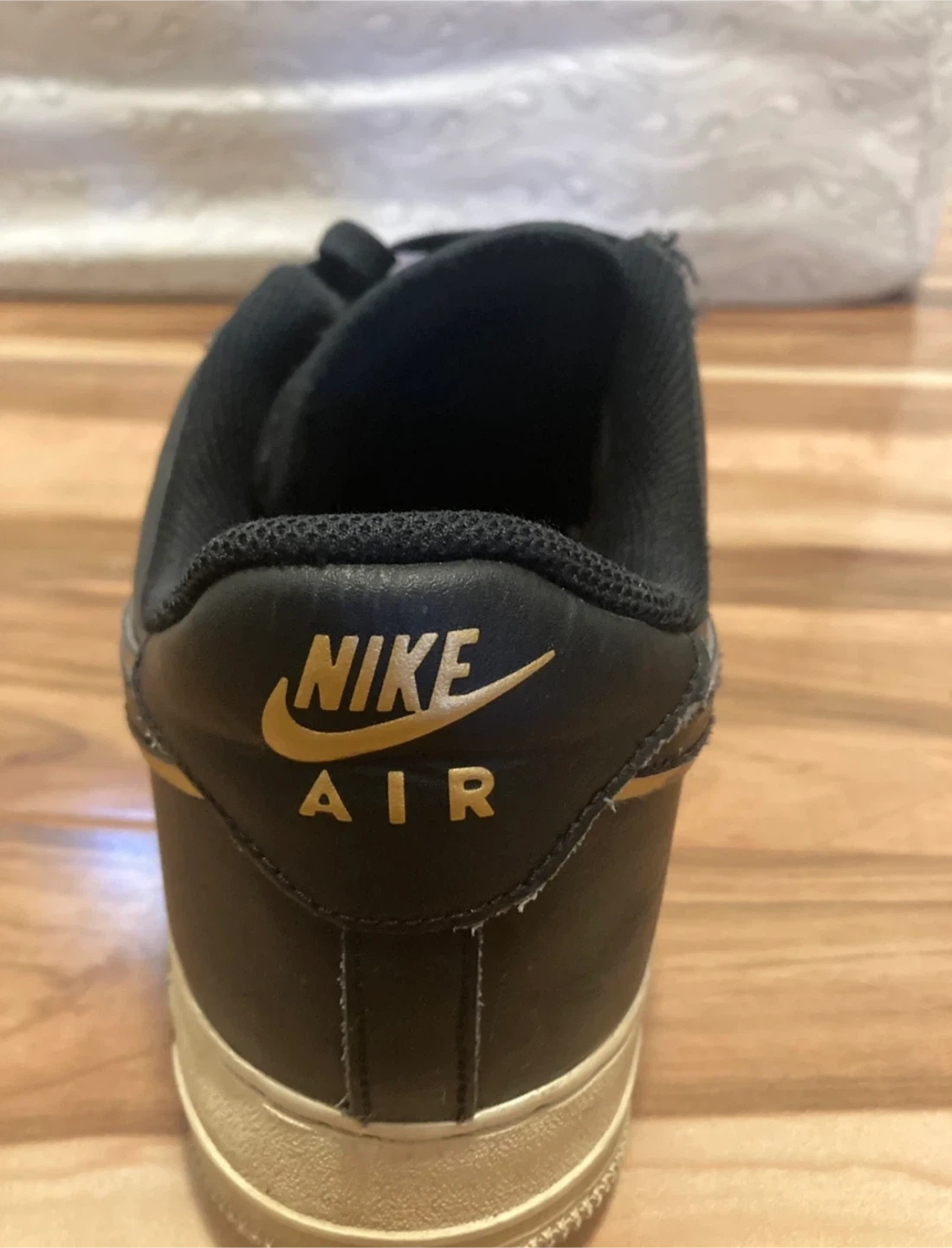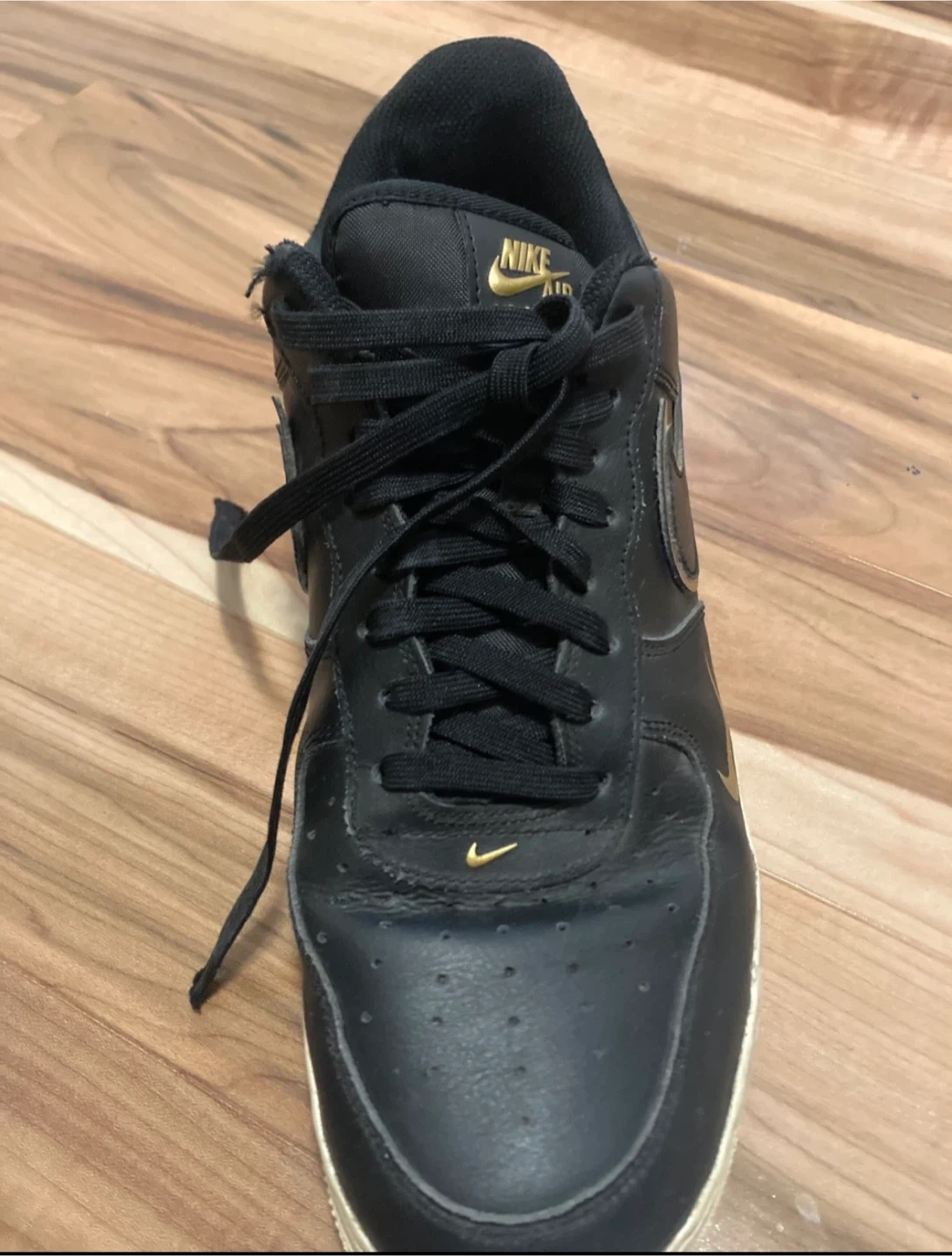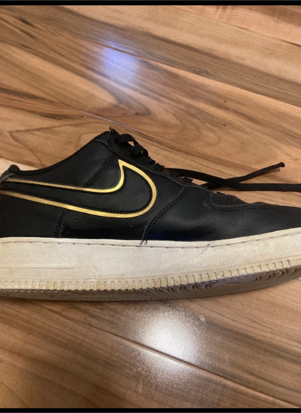 Selling a pair of Nike Air Force 1 sneakers in black with gold accents. They show some signs of wear, but still are great for gift or personal use!