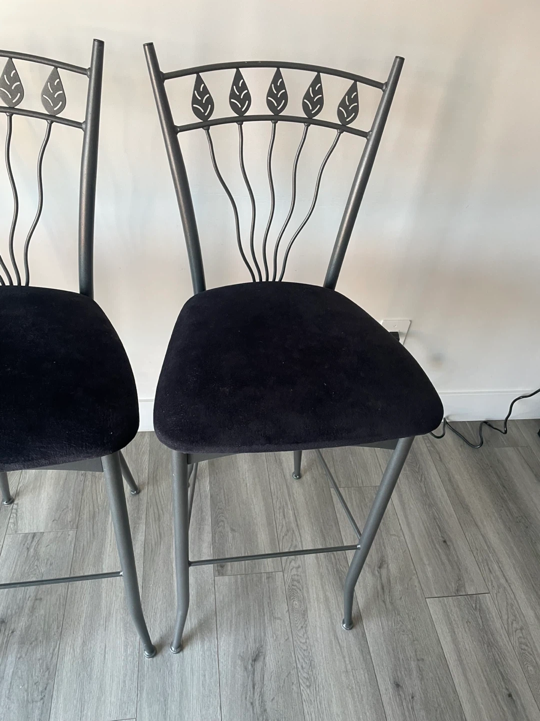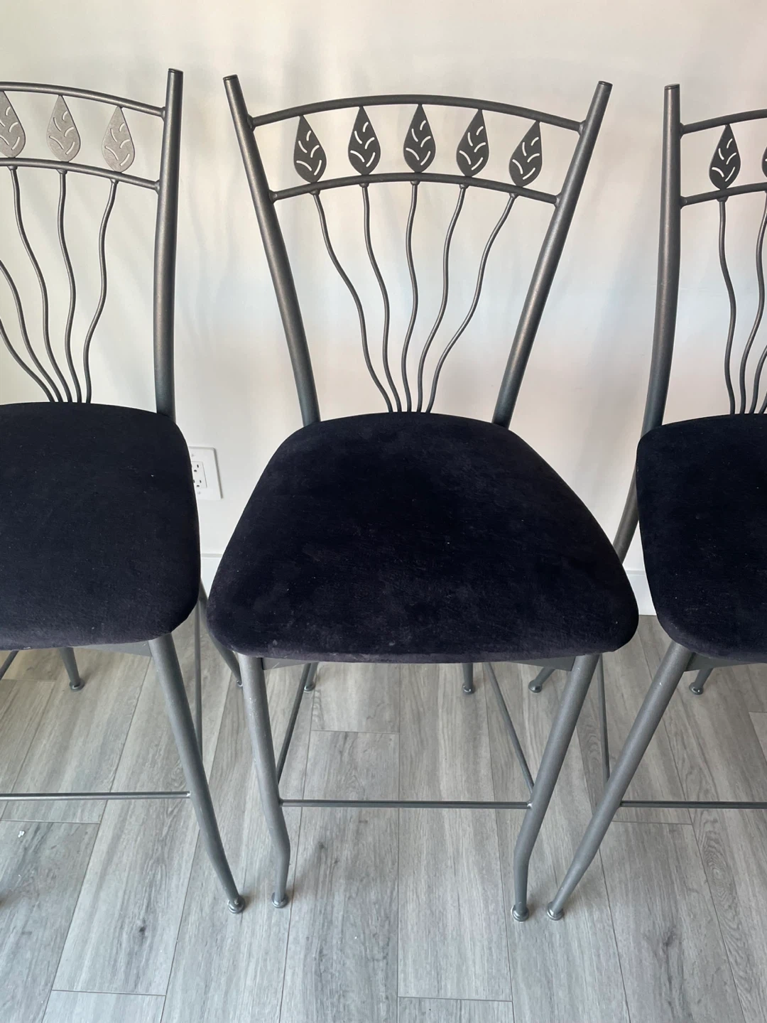 ($90 For All) Set of 3 Bar Stools. Black Velvet Seats, Metal Frame, A Leaf Design On The Back. It’s In Good Condition And Would Look Great In Any Kitchen Or Bar Area.