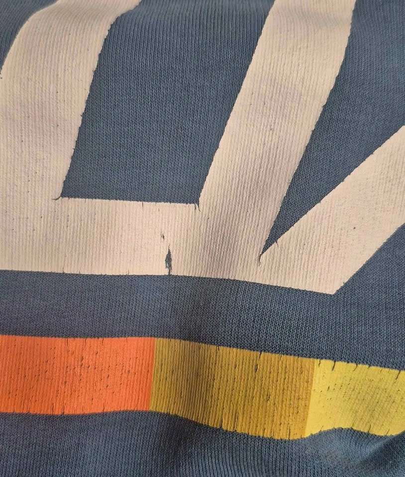 Please note: the bottom hem is partially separated and coming apart. The hood trim is also heavily scuffed and worn. The large front Fox logo print is cracked and faded. General fading throughout from use and washing. Fabric is still soft, but condition is well-used. Review all photos closely for true condition.