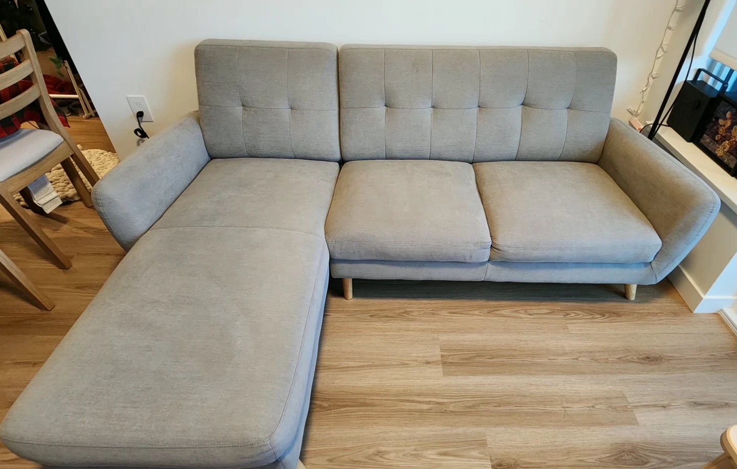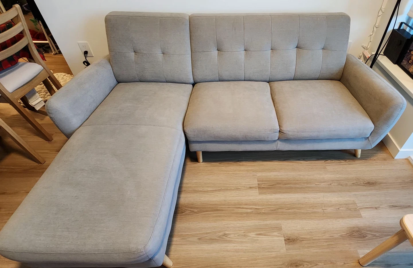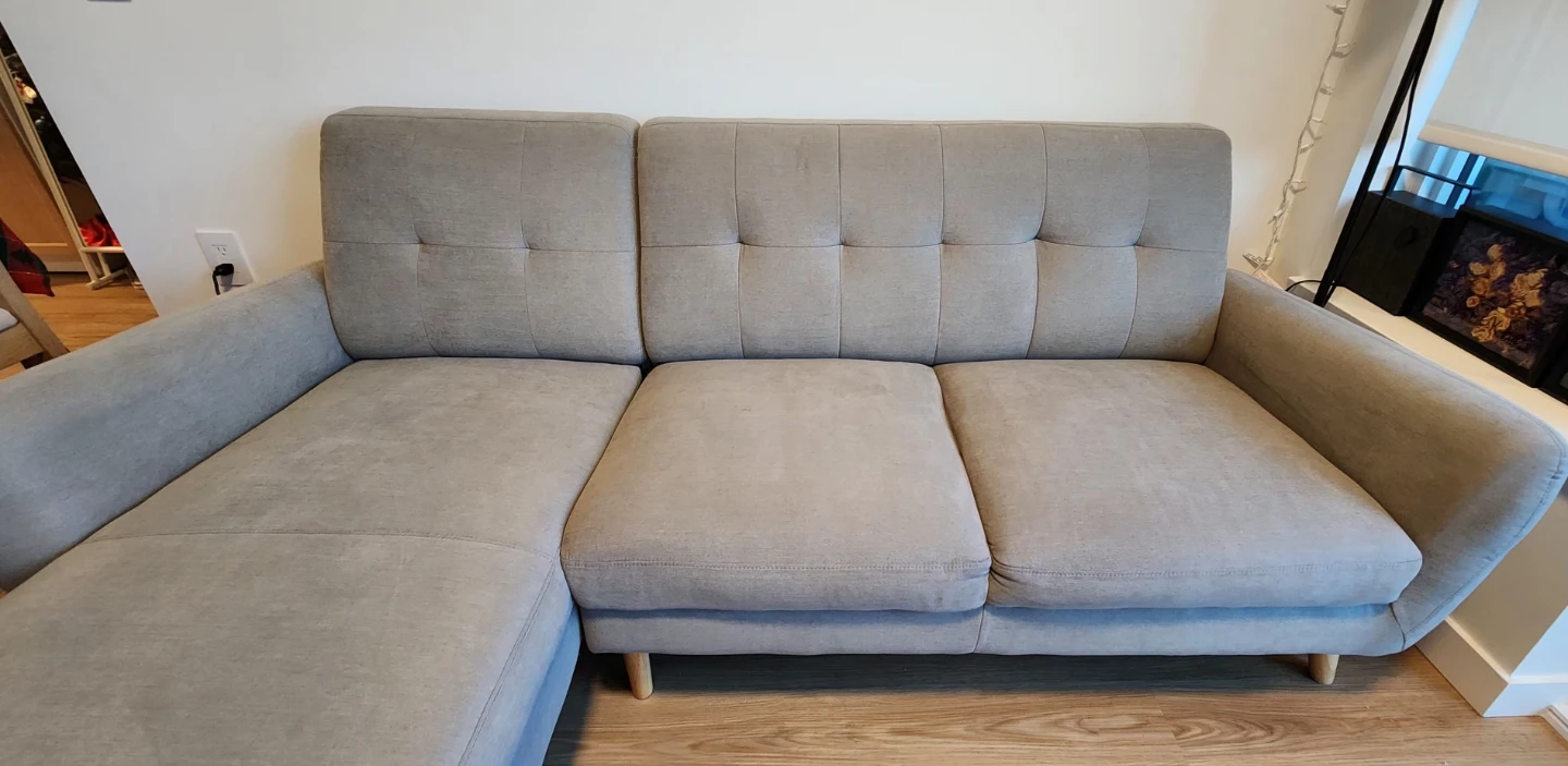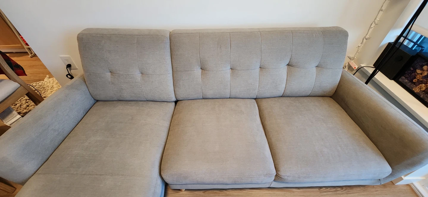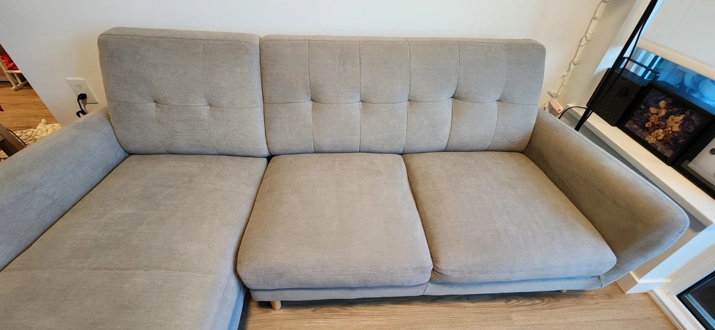 Selling a 3-seater light grey sectional sofa from Structube! It features a chaise lounge on one side, perfect for relaxing. The sofa has a button-tufted back and a modern design. It's in great condition and ready for a new home!