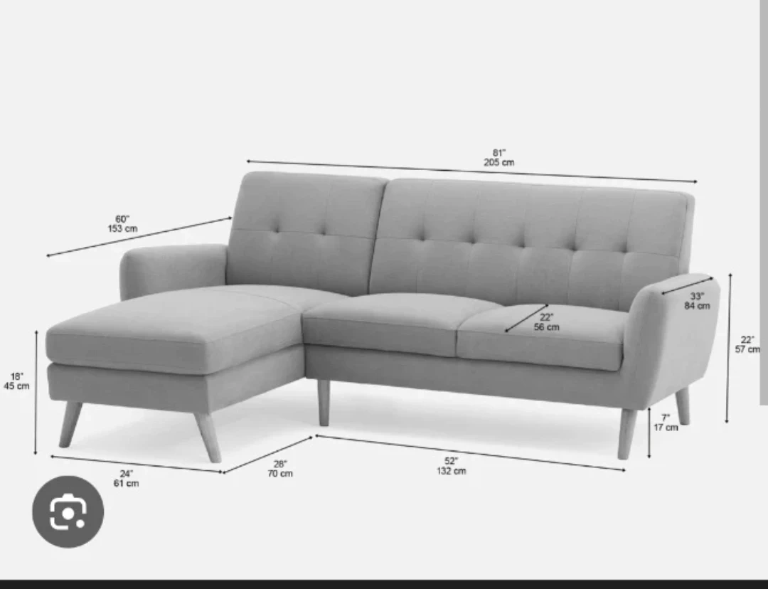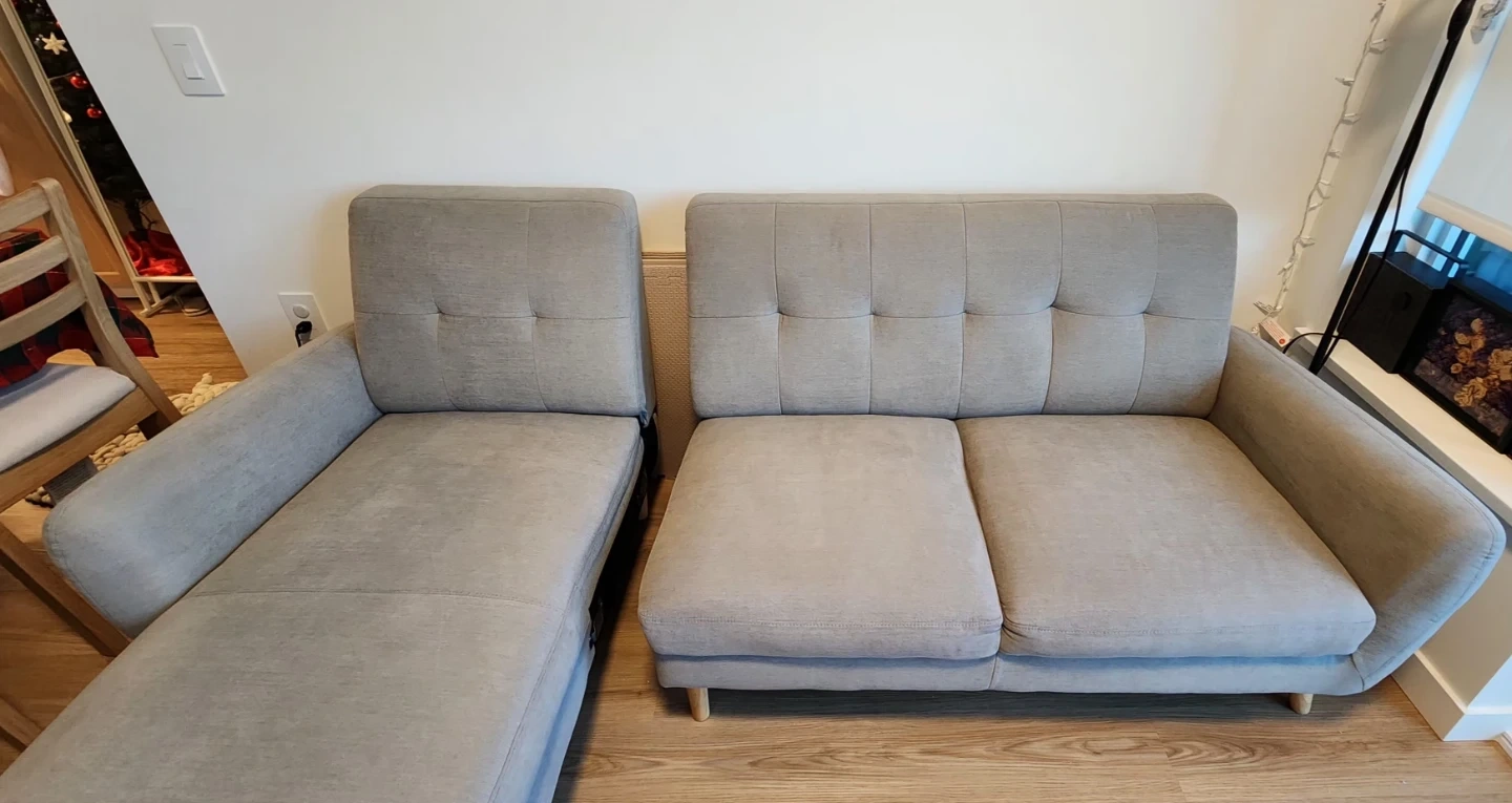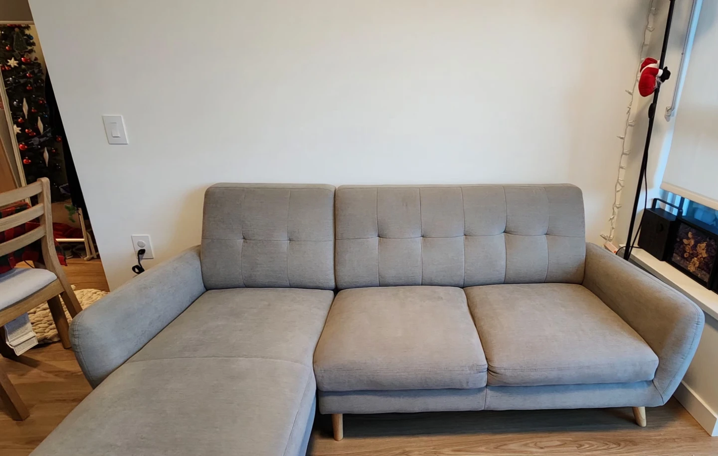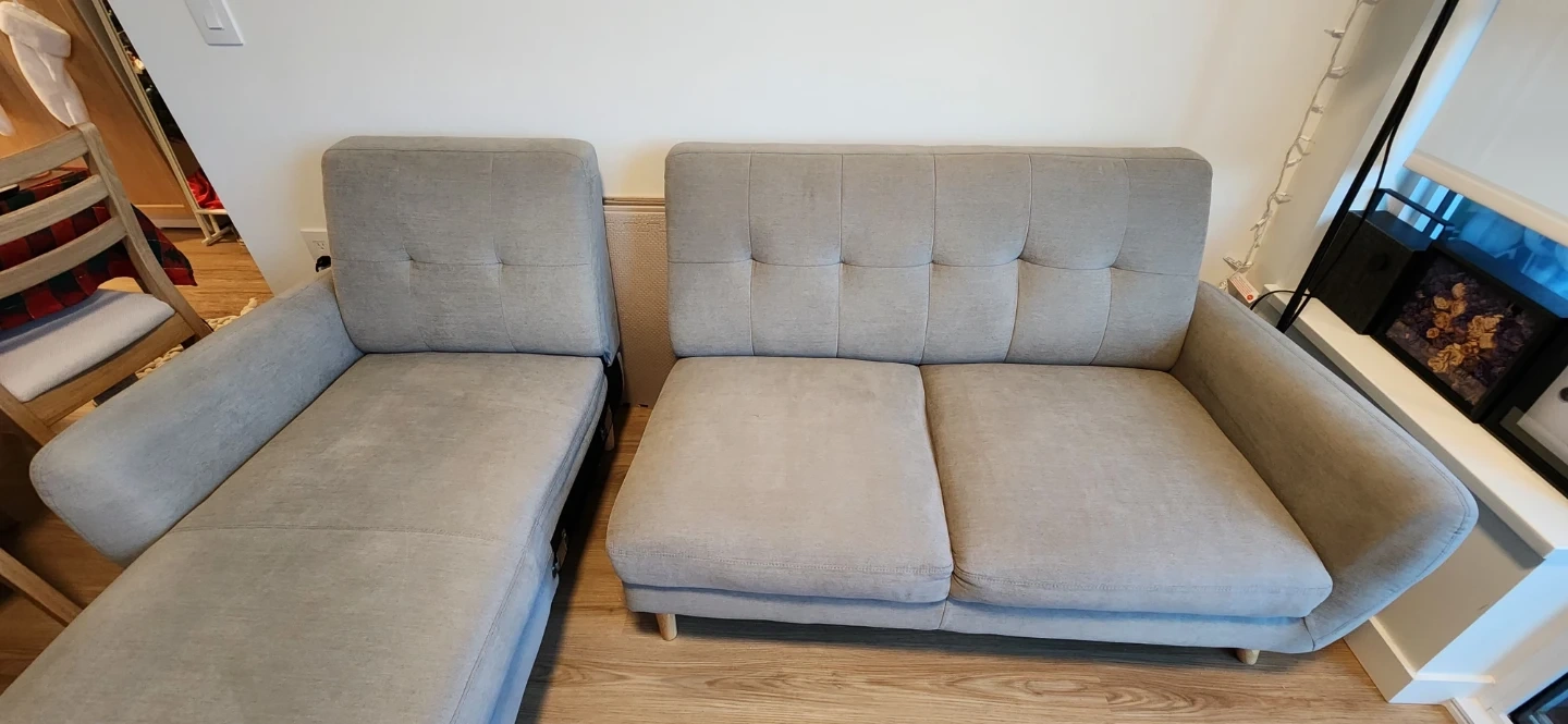 Selling a 3-seater light grey sectional sofa from Structube! It features a chaise lounge on one side, perfect for relaxing. The sofa has a button-tufted back and a modern design. It's in great condition and ready for a new home!