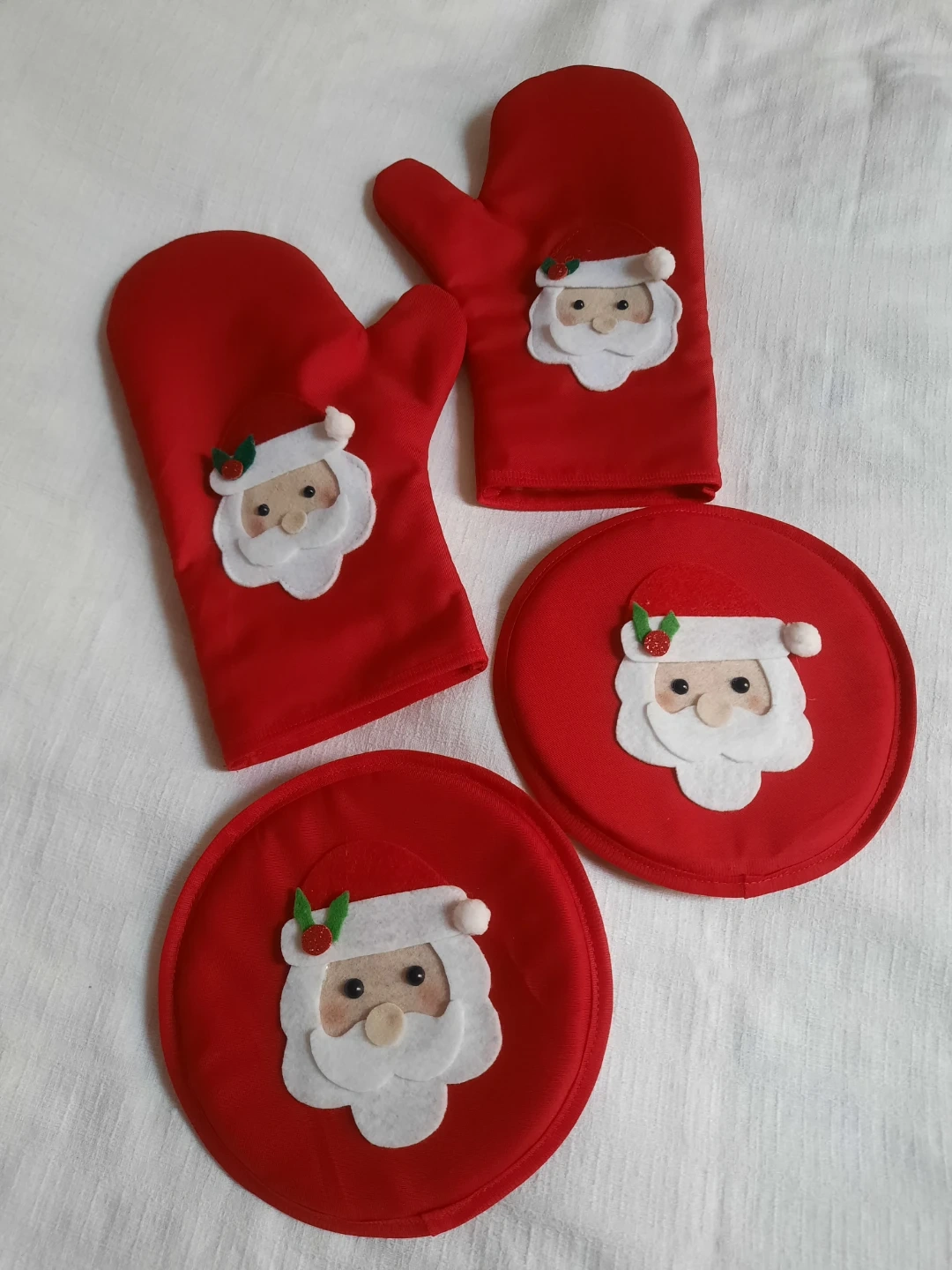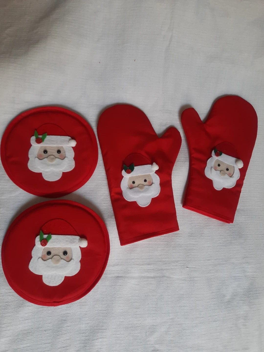 Here's a festive set of oven mitts and pot holders, perfect for adding some holiday cheer to your kitchen! They feature a cute Santa Claus design on a red background. They're new ( my handmade) and ready to help you with your holiday baking! Oven mitts $27 (one pair) Pot holder $9 each and $15 for both