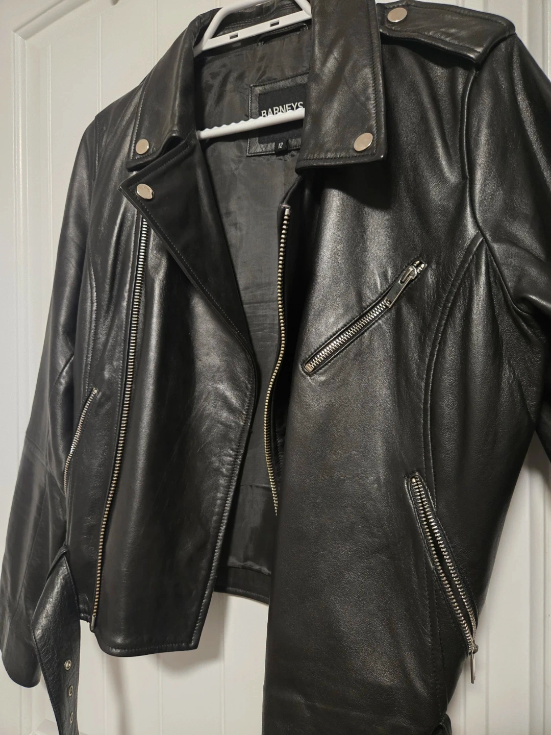 Selling a classic black leather jacket from Barneys New York. It's a size 12 and in great condition. Perfect for adding a bit of edge to any outfit!