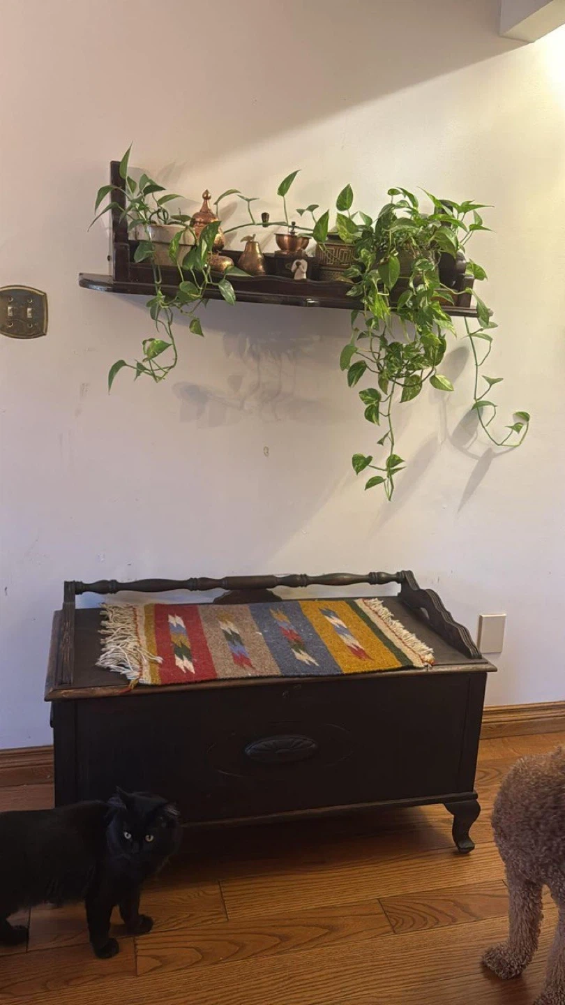 Selling an antique wooden storage trunk. It has a unique design and a colourful woven blanket on top. Perfect for adding a touch of vintage charm to your home!