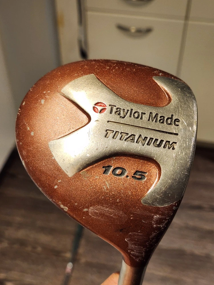1) Set of used golf clubs, including a Taylor Made Titanium driver (10.5) and a Tour Line TL56 sand wedge (SW 55°).