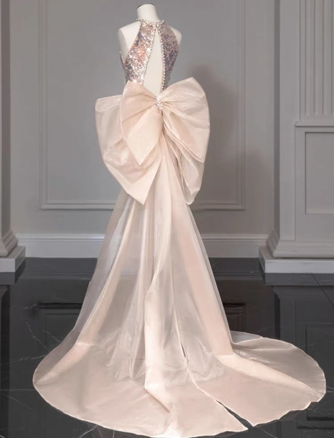 Check out this dazzling sequin mini dress! It features a halter neckline and a stunning oversized bow. Perfect for parties or special occasions. The bow is removable