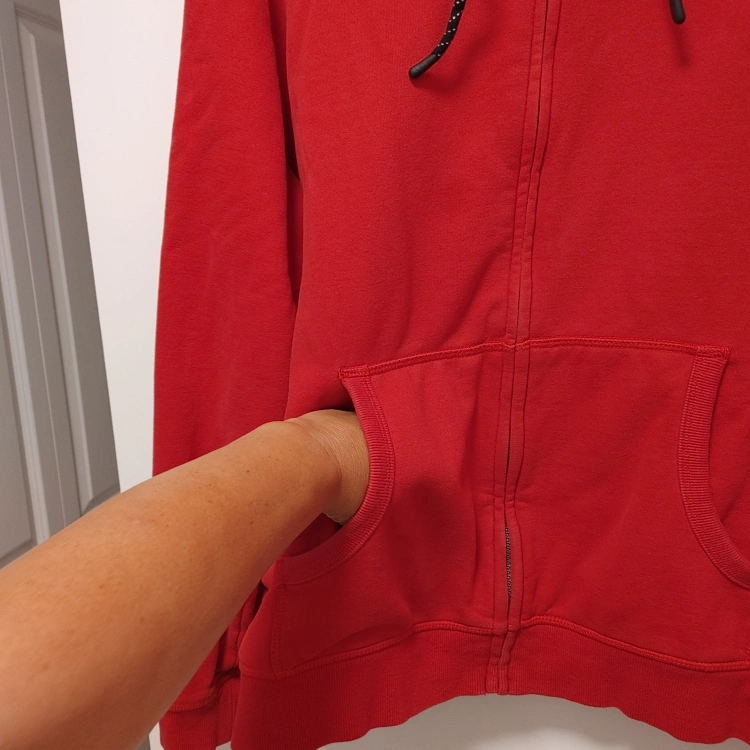 Selling a red Canadiana zip-up hoodie in size large. It features a moose design and the word "Canada" on the front. The hoodie is in good condition