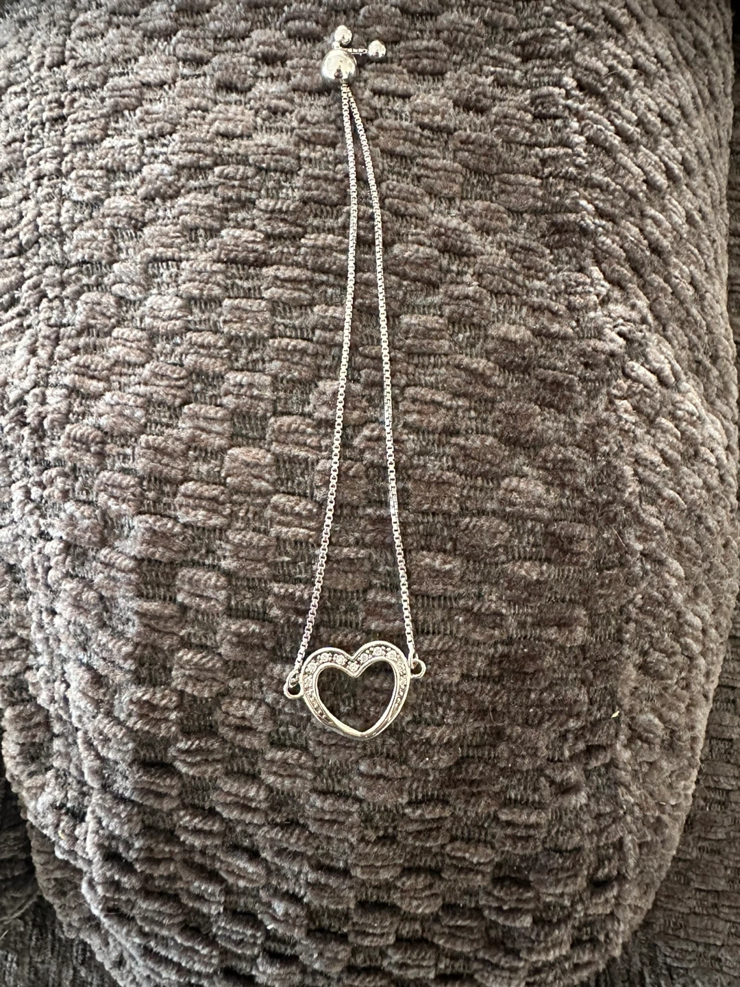 A cute and dainty heart charm bracelet. It features a heart-shaped charm adorned with small stones, adding a touch of sparkle. Has 9.25 stamp