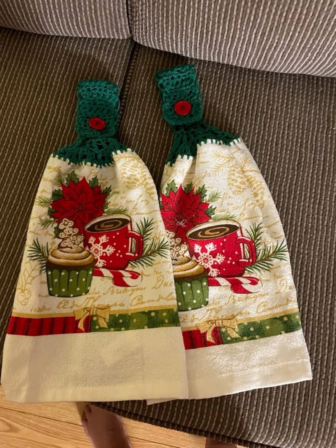 Here are two handmade hanging kitchen towels! They have a crocheted top with a button for easy hanging. The towels feature festive designs, perfect for adding a touch of charm to your kitchen. One set has a deer and forest scene, while the other has a coffee and cupcake design