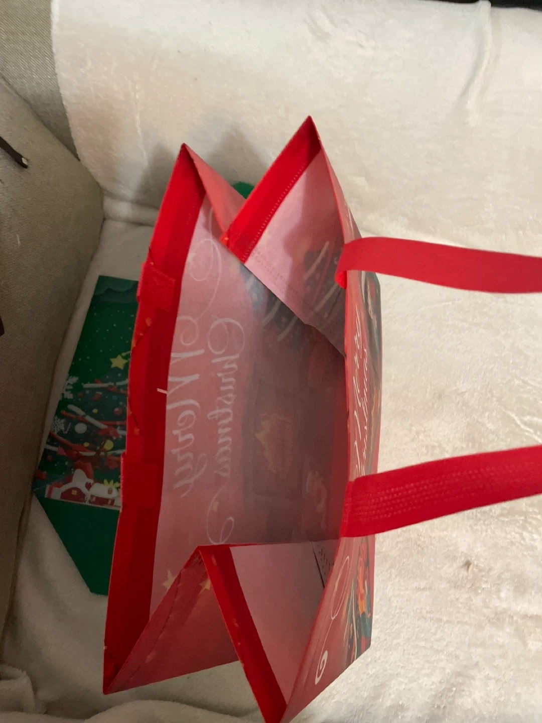 Selling a set of two reusable shopping bags with festive Christmas designs! One is green with a 'Merry Christmas' message and a Santa scene, and the other is red with a fireplace and a girl opening gifts. Perfect for holiday shopping! One for $3 or $5 for both