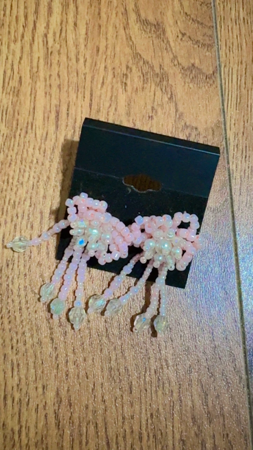 Selling a pair of cute pink beaded flower earrings! They have a unique design with beaded strands hanging down. Perfect for adding a touch of whimsy to any outfit