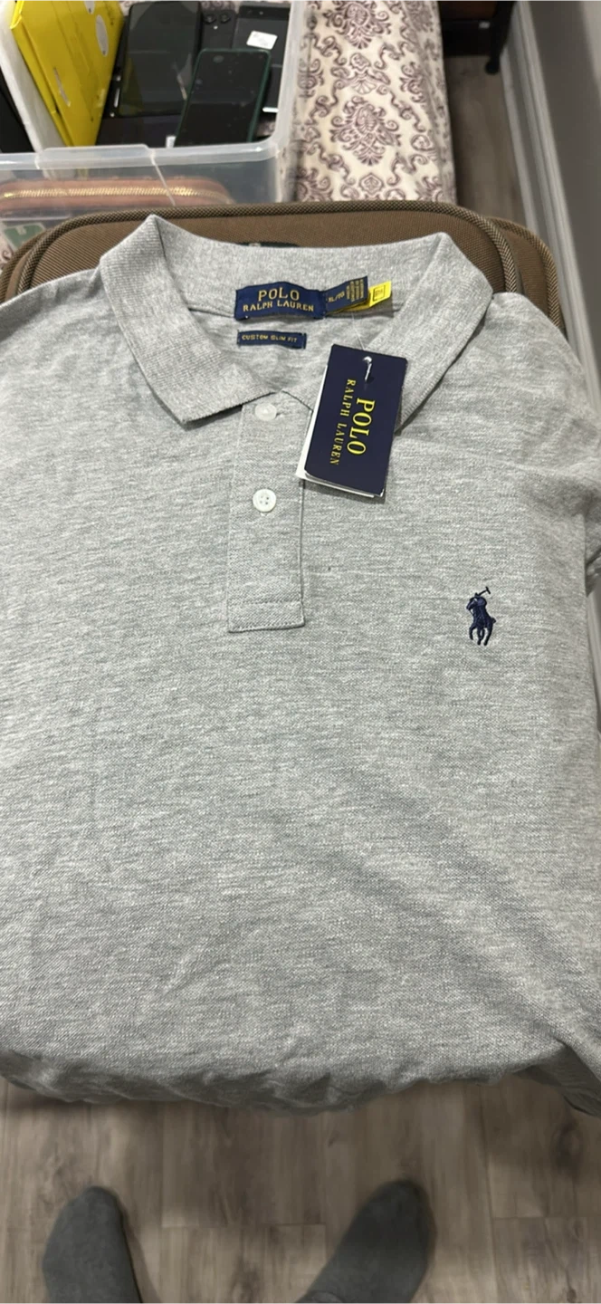 I'm selling a Polo Ralph Lauren polo shirt in size XL. It's a custom slim fit and is a nice light grey colour. The polo has never been worn and still has the tags on it!