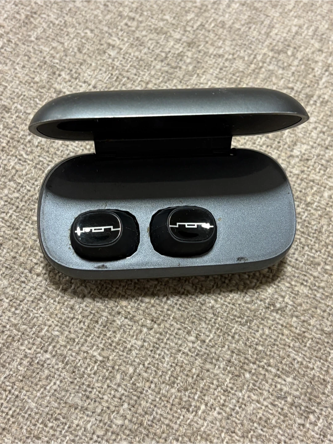Selling a pair of Sol Republic Amps Air 2.0 wireless earbuds. They come with their charging case! There are some signs of use on the case, but the earbuds themselves are in good condition.