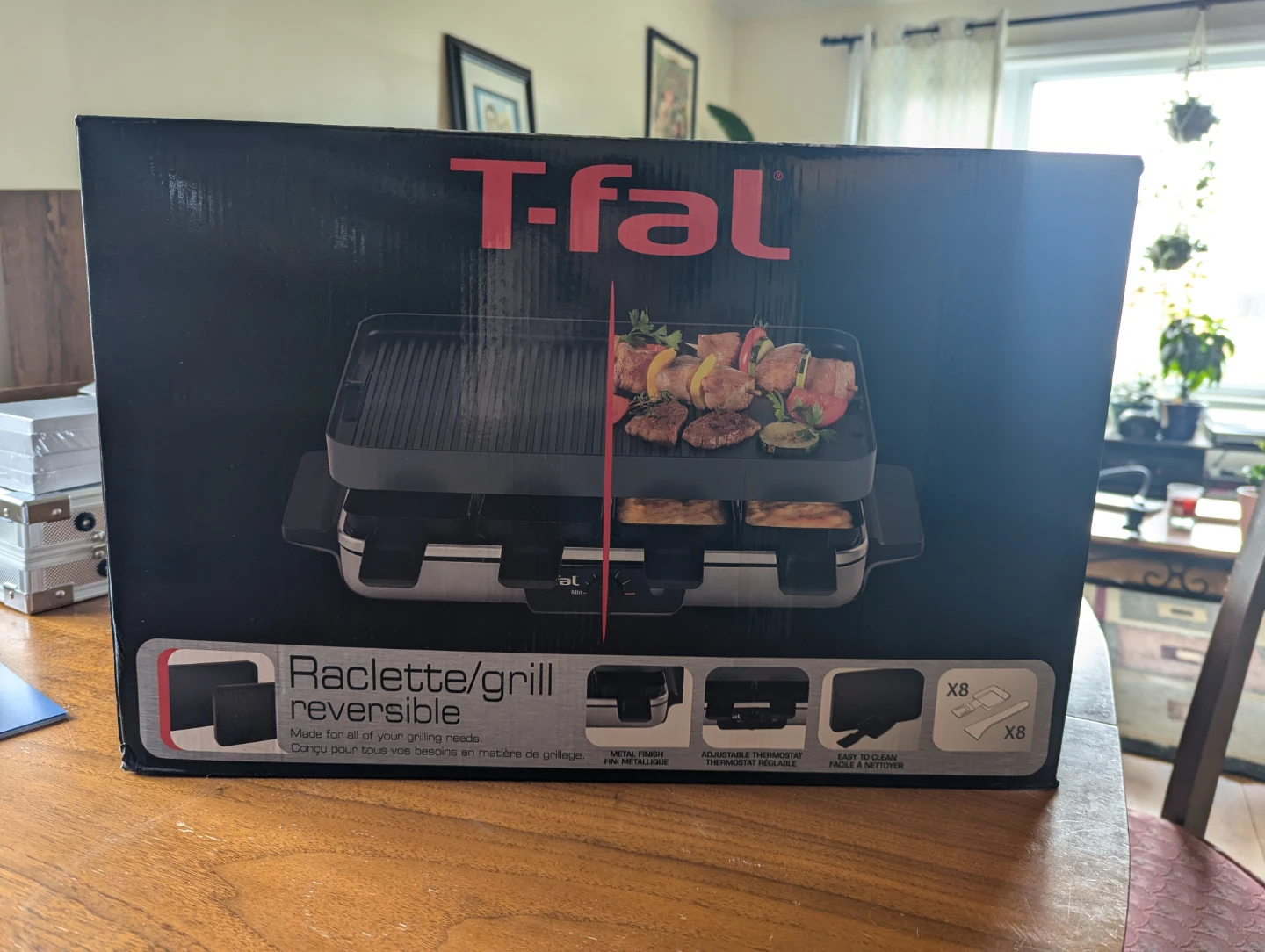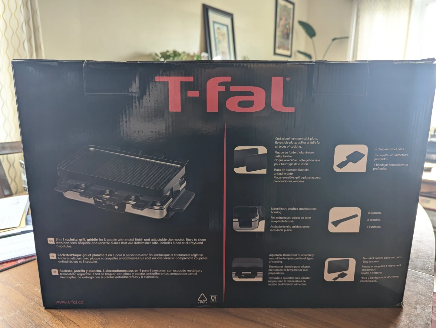 Wedding gift that was never opened, a T-fal Raclette/Grill reversible in great condition! It's a 3-in-1 raclette, grill, and griddle for 8 people. It features a metal finish and adjustable thermostat. Easy to clean with non-stick hotplate and raclette dishes that are dishwasher safe. Includes 8 non-stick trays and 8 spatulas