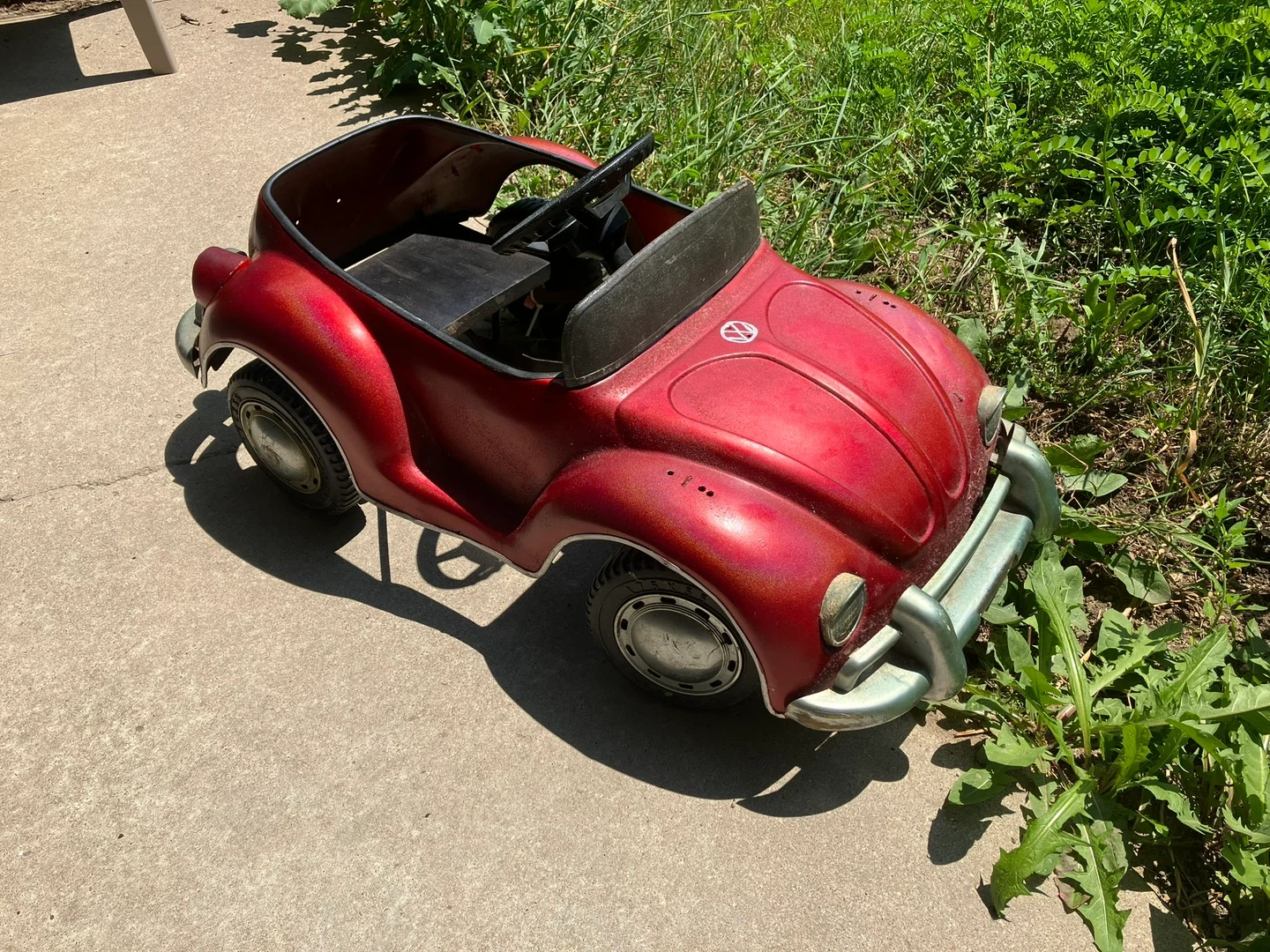 Selling a vintage VW Beetle pedal car for little kids. These were manufactured by Rocky Mountain motor works in the very early 70’s. The original grey paint was really worn down, so it is now wearing rainbow sparkle red spray paint. Not the best paint job I will admit, but it did its job. It is missing the original seat but has a wood board in its place. Also, the plastic horn and front decorative turn signals were missing when I acquired it. But, still has its original headlights, tail lights, bumpers, windshield, and hub-caps. Fix it up and your lil guy or girl will be the coolest kid on the block. Cash only and pick up in Bathurst Manor.