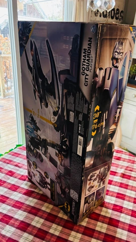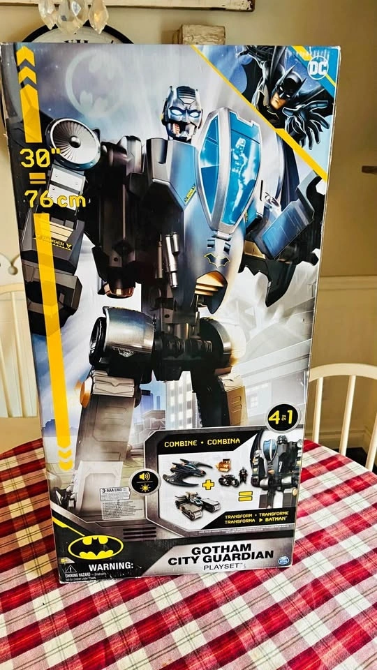 Brand new in sealed box that has never been opened! Sells at Toys R Us for $149 plus tax. Toysrus Recommended Age: 5 - 8 years. This incredible playset includes three iconic Batman vehicles - the Batwing, BatTank, Batcycle - and Mobile Command Centre that combine to form one giant Mech Batman, encouraging your child's imagination and storytelling possibilities. With 40+ thrilling sounds and LED lights, the Gotham City Guardian Playset comes to life!