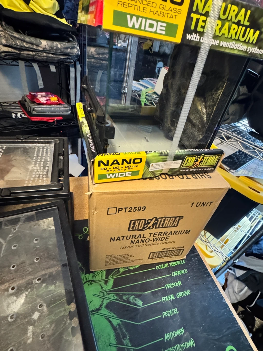I'm selling an Exo Terra Nano Wide Natural Terrarium. It's an advanced glass reptile habitat with a unique ventilation system. It measures 20 x 20 x 20 cm, which is about 8" x 8" x 8".