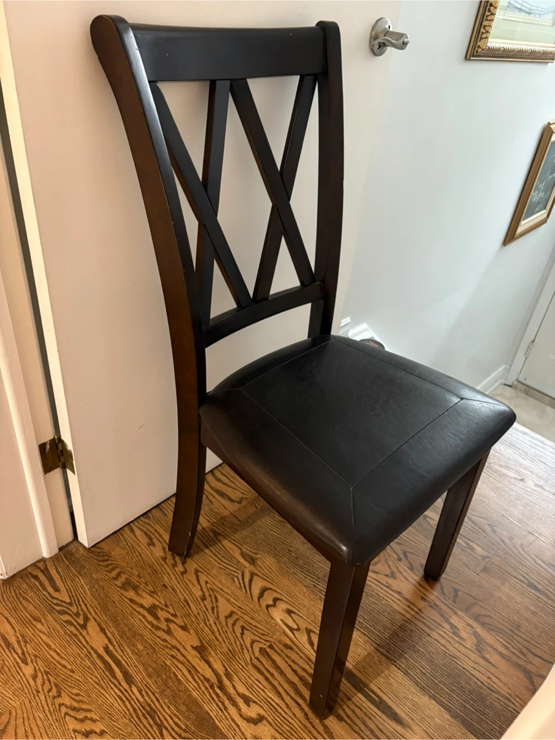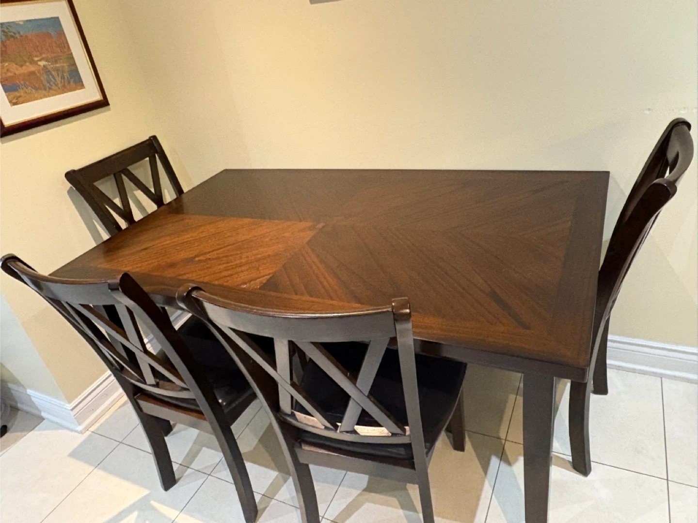Selling a dark wood dining table with four matching chairs. The table has a beautiful wood grain pattern on the top, and the chairs have a classic design with a comfortable seat. It's a great set for a smaller dining space or kitchen nook!