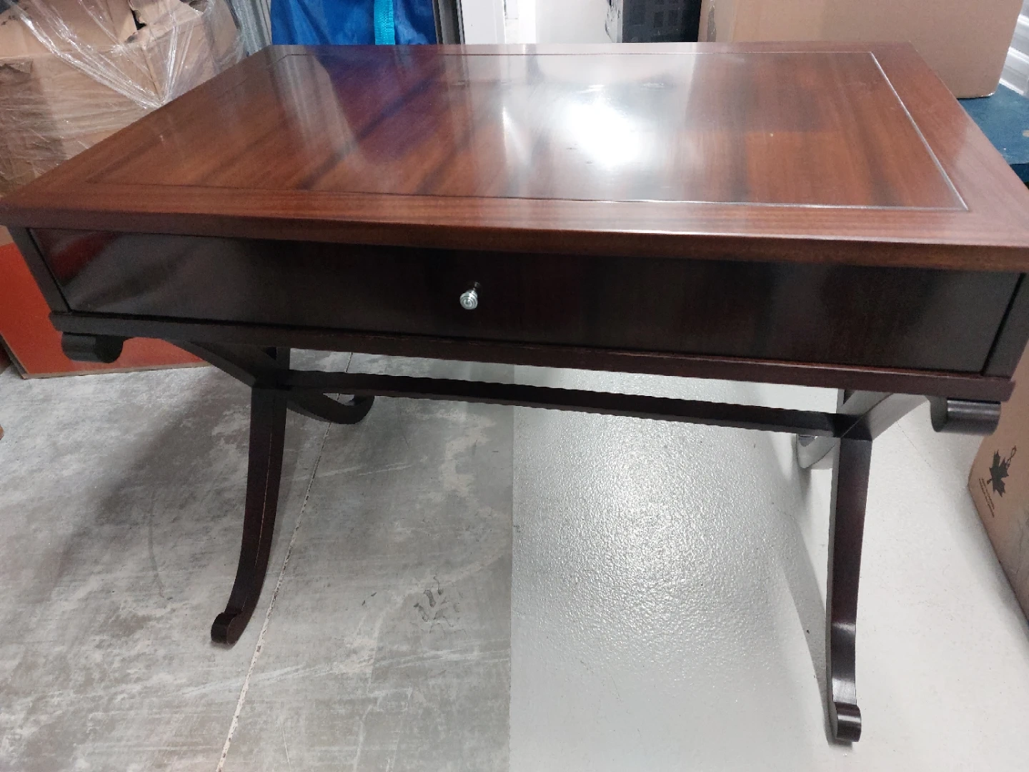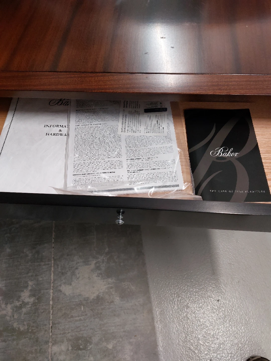 Here's a beautiful mahogany coffee table from Baker Furniture! It features a sleek design and a convenient drawer for storage. The care and information hardware pamphlets are included.