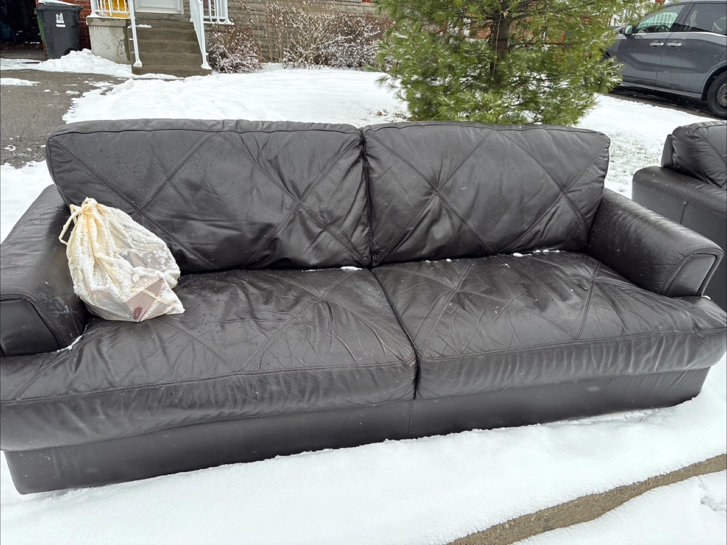 Dark brown Leather couch on the curb in Ionview neighbourhood. Feet are in the bags on top.