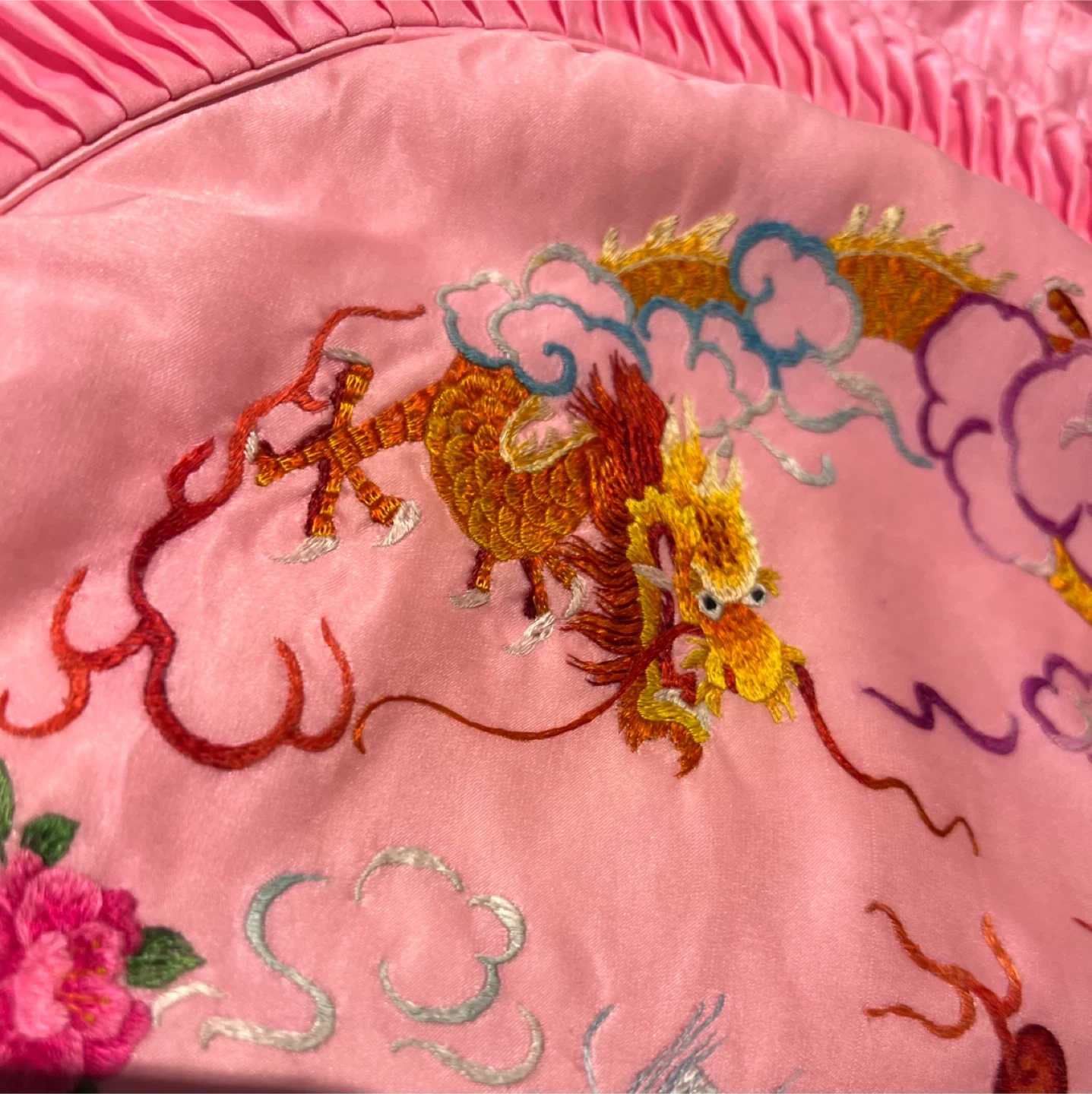 Beautiful embroidery of dragon, phoenix and flowers on a soft pink satin fabric