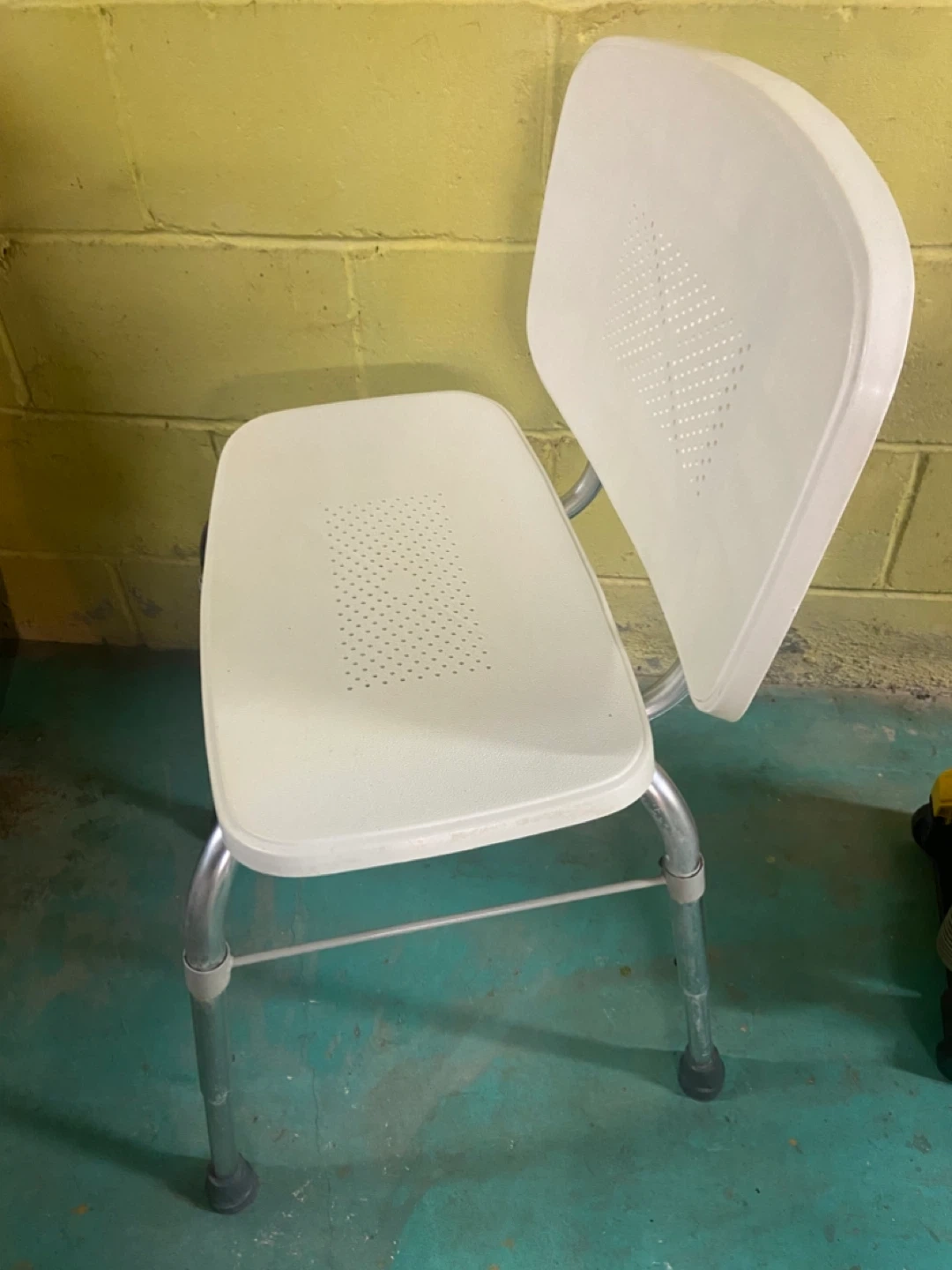 Selling a bath chair with a backrest! It's in good condition and perfect for anyone needing a little extra support in the shower or bath. Adjustable height.