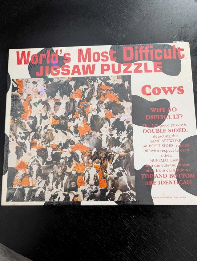 Test your puzzling skills with this new Buffalo Games 'World's Most Difficult Jigsaw Puzzle - Cows' featuring 529 double-sided pieces! This unique puzzle is double-sided, showing the same image on both sides, but rotated 90 degrees, making it extra challenging. It is still sealed in the original packaging, ready for you or a gift for someone who likes puzzles! Specifications: