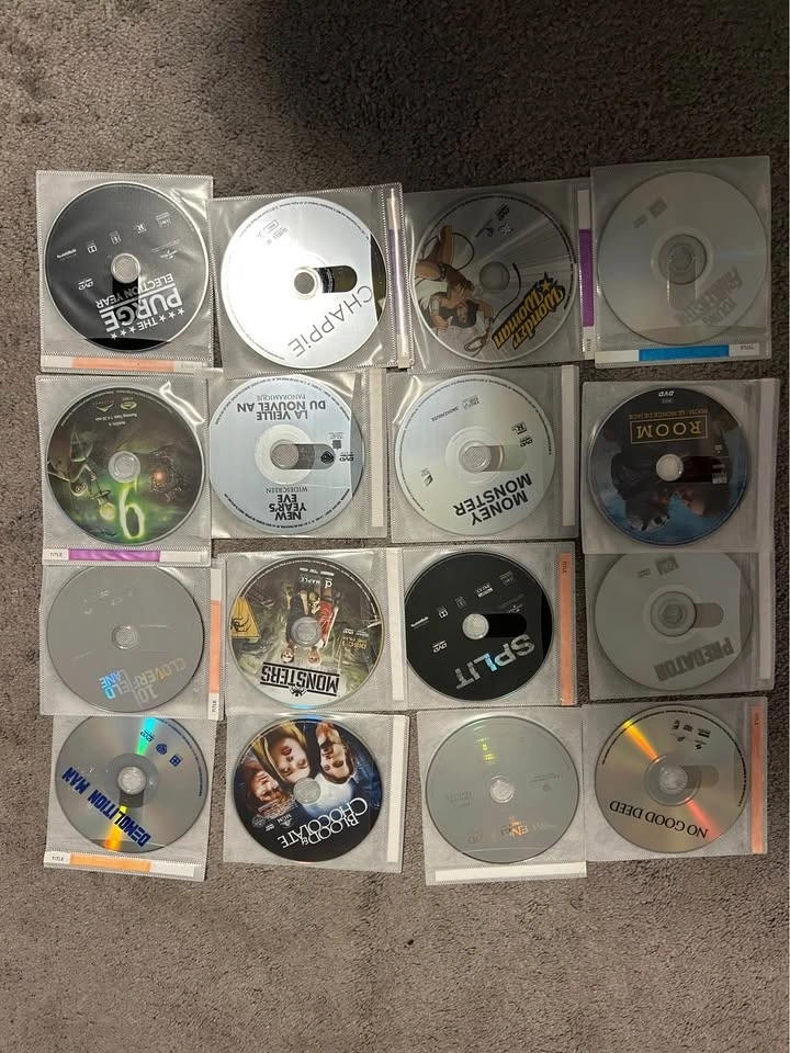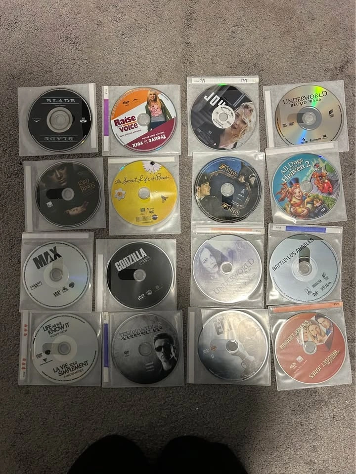 All movies are in good condition. Movie list: War of the Worlds The Girl with the Dragon Tattoo Barbie: The Secret Door Barbie: Fashion Fairytale Barbie: The Nutcracker Barbie: The Pearl Princess Barbie: Fairytopia Barbie: Mariposa Barbie: The Island Princess Barbie: Pearl Princess Barbie: Thumbelina The Secret of Nimh Justice League Unlimited The Mist Atomic Blonde No Good Deed Sweeney Todd Predator 1-2 Room Absolutely Anything Monster Money The Call Wonder Woman Young Frankenstein Demolition Man Blood and Chocolate Queen of the Damned 10 Cloverfield Lane Cloverfield Split Monsters House of Wax AI Artificial Intelligence Urban Legends Kidnap The Host Don’t Breath Final Destination Blade The Purge: Election Year The Purge: Anarchy Chappie District 9 New Year’s Eve Valentine’s Day 9 Max Underworld: Blood Wars Underworld: Evolution Underworld Underworld: Rise of the Lycans Underworld: Awakening Joy Terminator: Judgement Day Gattaca Life as We Know It The Mermaid Godzilla The Secret Life of Bees The Book of Eli I Am a Legend Bridget Jones's Diary What Are You Capable Of Battle: Los Angeles Gamer A Bear Named Winnie All Dogs Go to Heaven 1-2 Titanic Planet of the Apes: Dawn of... Planet of the Apes: War of... Prom Night An American Werewolf in London Life of Pi Coraline A Quiet Place The Happening Back Country Mamma Mia The Da Vinci Code Love Actually Let me know if you're interested!