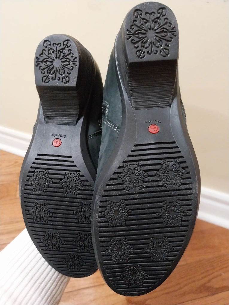 Lovely tall grey/black buckskin leather boots from Blondo. Aqua Protect. Waterproof. Comfort rubber sole. Low heal. Inside long zipper with outside decorative shorter one and ankle strap buckle detail. Label size says 7.5W but I find the fit is closer to (6.5 - 7). New with tags. Floor model. No original box. Does not include boot shappers. Thanks for your interest!