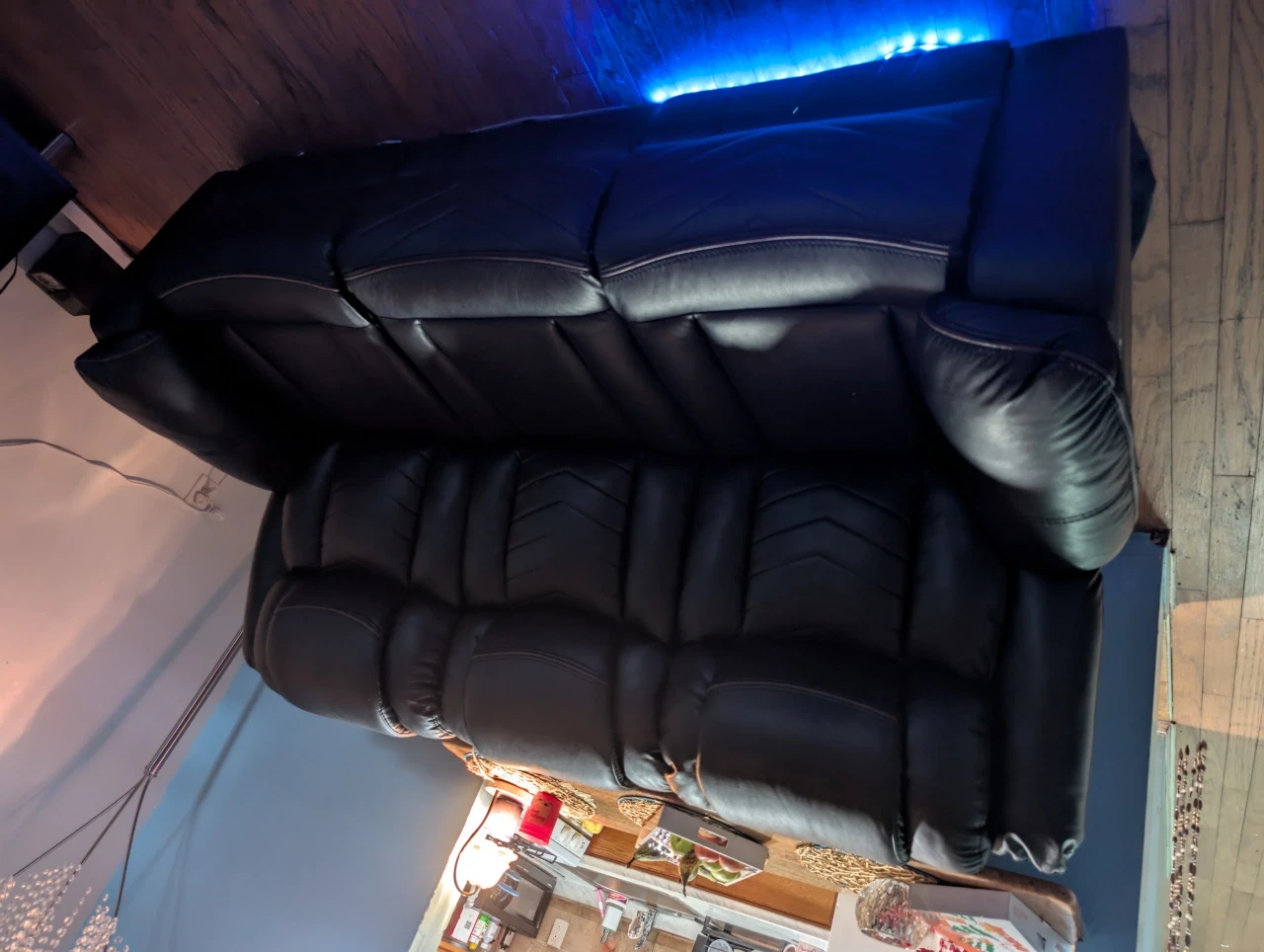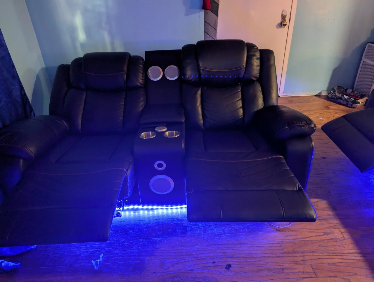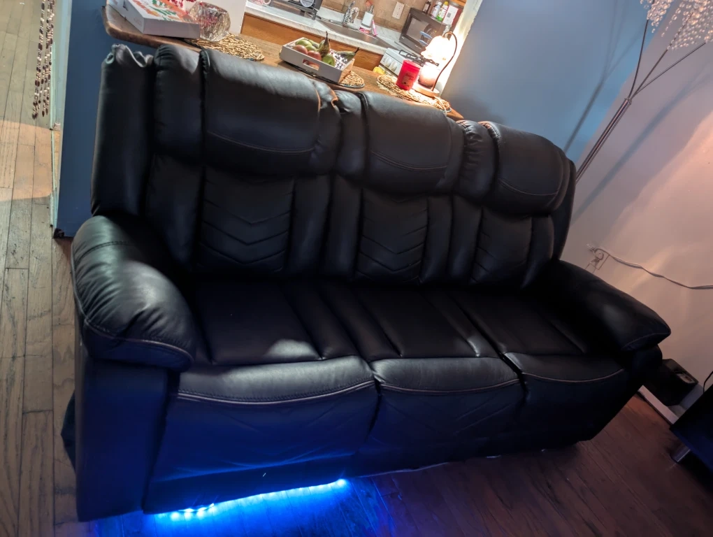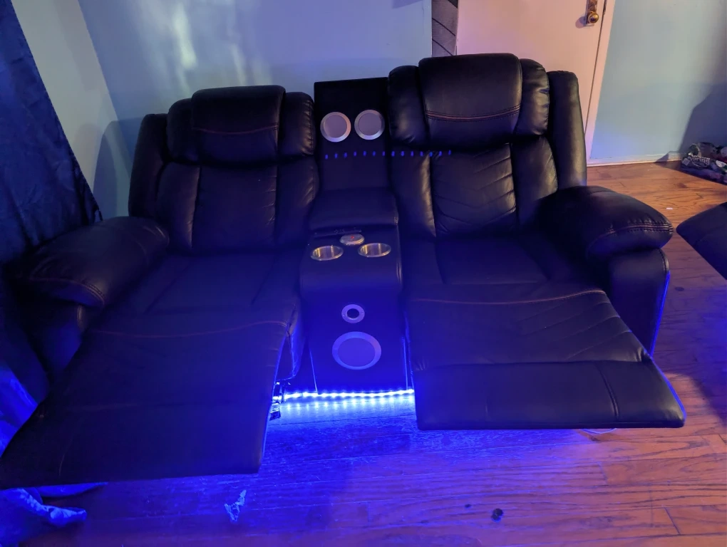 Selling a black leather power reclining loveseat! It features a center console with cupholders and speaker. The loveseat also has blue LED lighting underneath. It's perfect for a home theater or living room setup, bought it a couple months ago moving out the state can't take it with me it's perfectly fine smoke free home