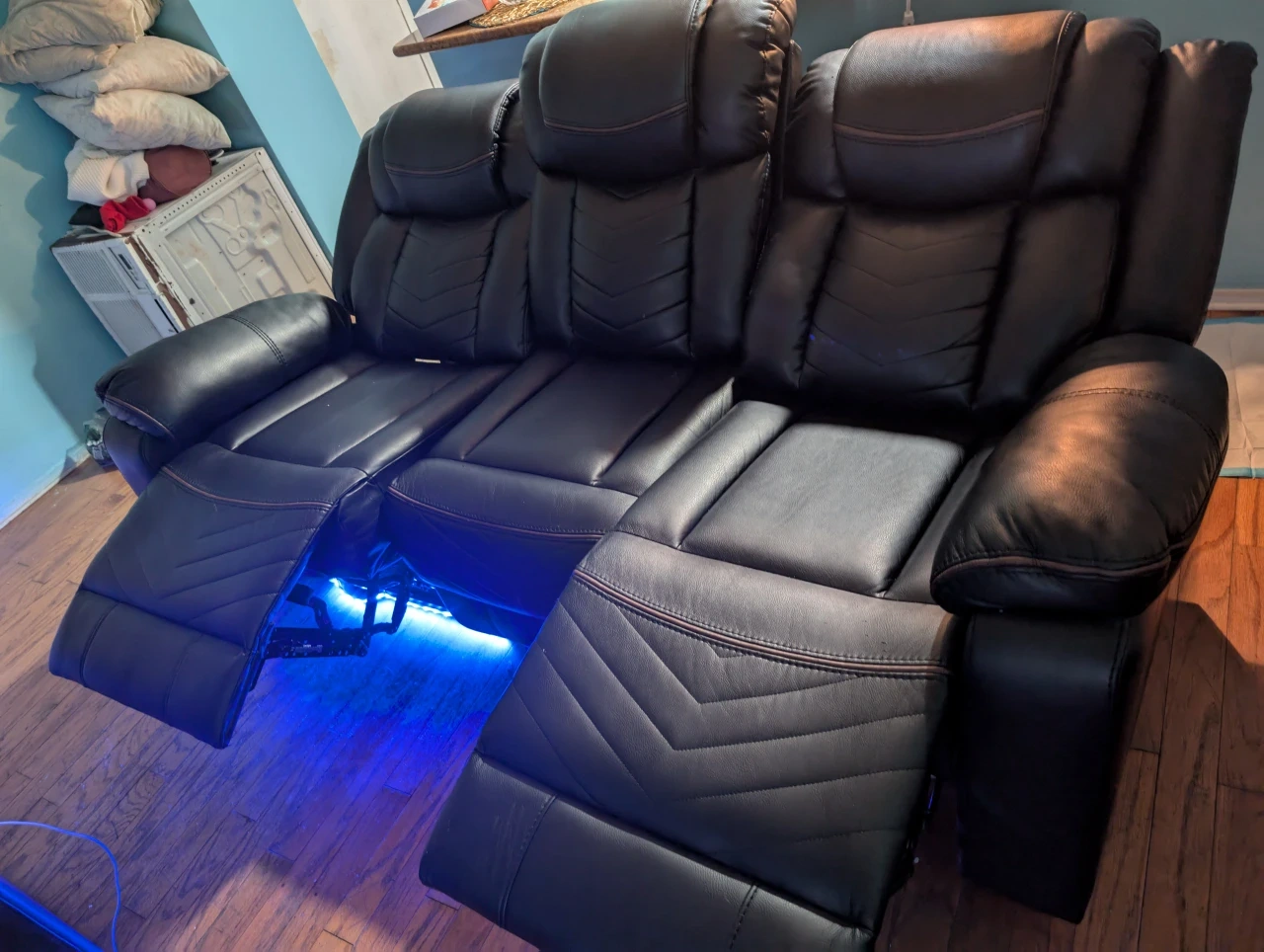 Selling a black leather power reclining loveseat! It features a center console with cupholders and speaker. The loveseat also has blue LED lighting underneath. It's perfect for a home theater or living room setup, bought it a couple months ago moving out the state can't take it with me it's perfectly fine smoke free home