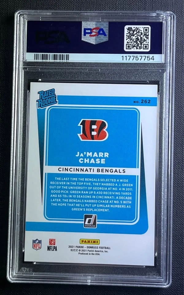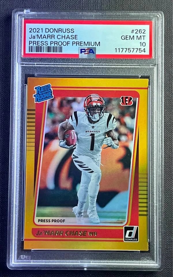 Elevate your sports card collection with the 2021 Panini Donruss Rated Rookie Press Proof Premium card featuring the dynamic wide receiver Ja'Marr Chase. Card number 262 from the set boasts a stunning Gold Press Proof parallel, a must-have for enthusiasts and fans of the Cincinnati Bengals. This sought-after rookie card has been professionally graded by PSA and awarded a perfect score of 10, confirming its premium quality. $150 OBO. FS/FT