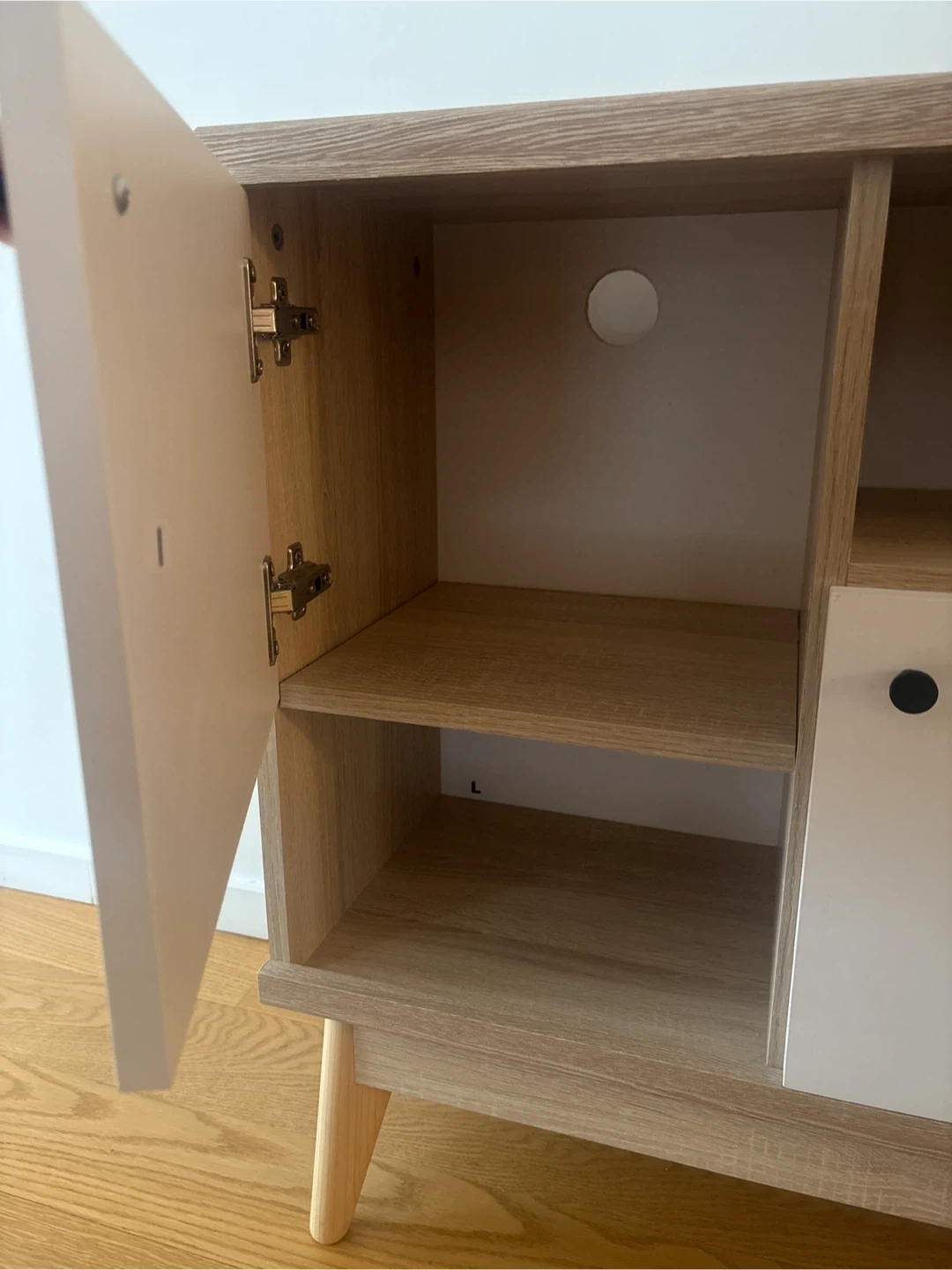 Selling a stylish TV stand with a light oak wood grain finish and white cabinet doors. It has a mid-century modern design with tapered legs. There are multiple storage compartments, including open shelving and cabinets with black round knobs. Perfect for organizing your entertainment area!