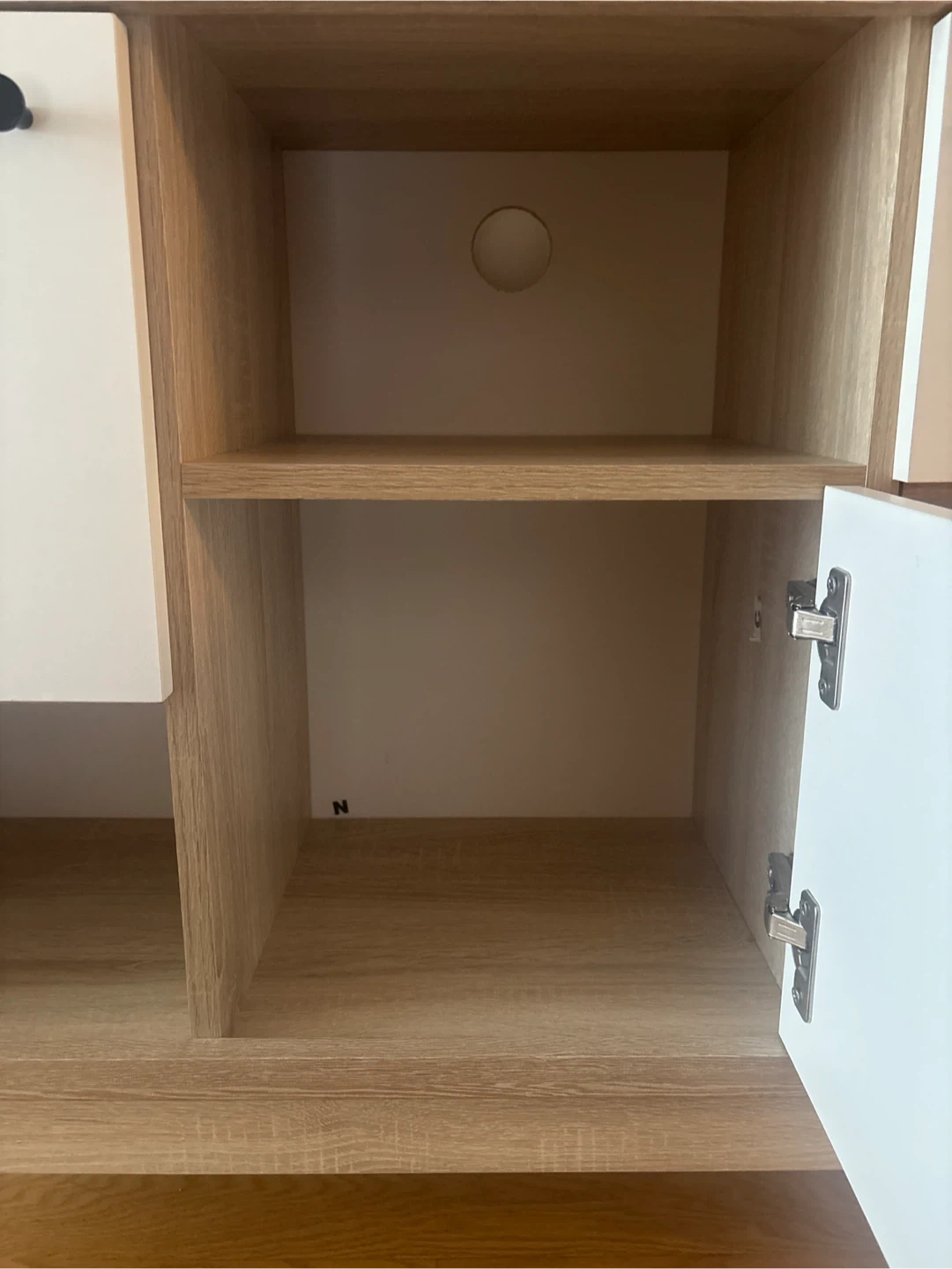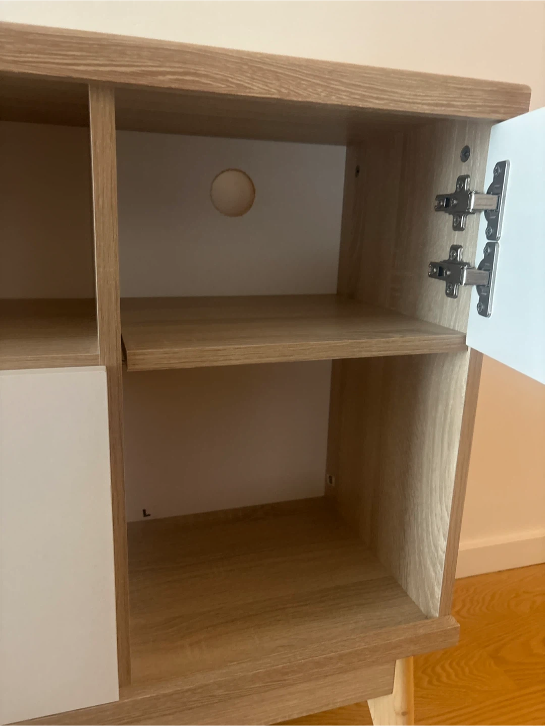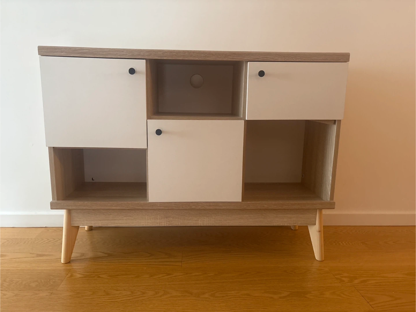 Selling a stylish TV stand with a light oak wood grain finish and white cabinet doors. It has a mid-century modern design with tapered legs. There are multiple storage compartments, including open shelving and cabinets with black round knobs. Perfect for organizing your entertainment area!