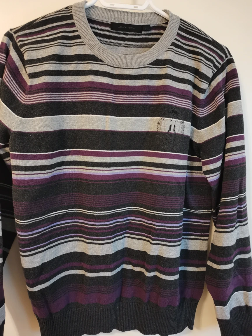 Here's a Jack & Jones sweater with a striped design! The size is 175/96A. It has a grey, black, and purple colour scheme. Perfect for adding a bit of style to your wardrobe