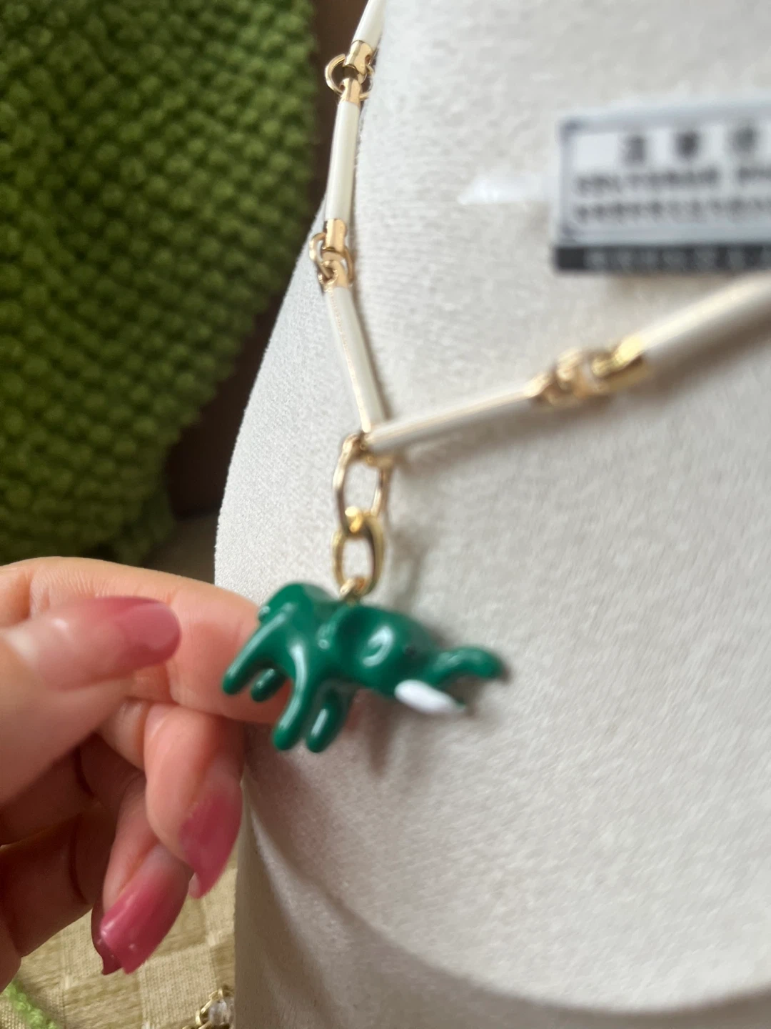 Cute elephant pendant necklace with a white and gold chain. The elephant charm is a vibrant green colour. It's in great condition and ready to add a touch of whimsy to your style!
