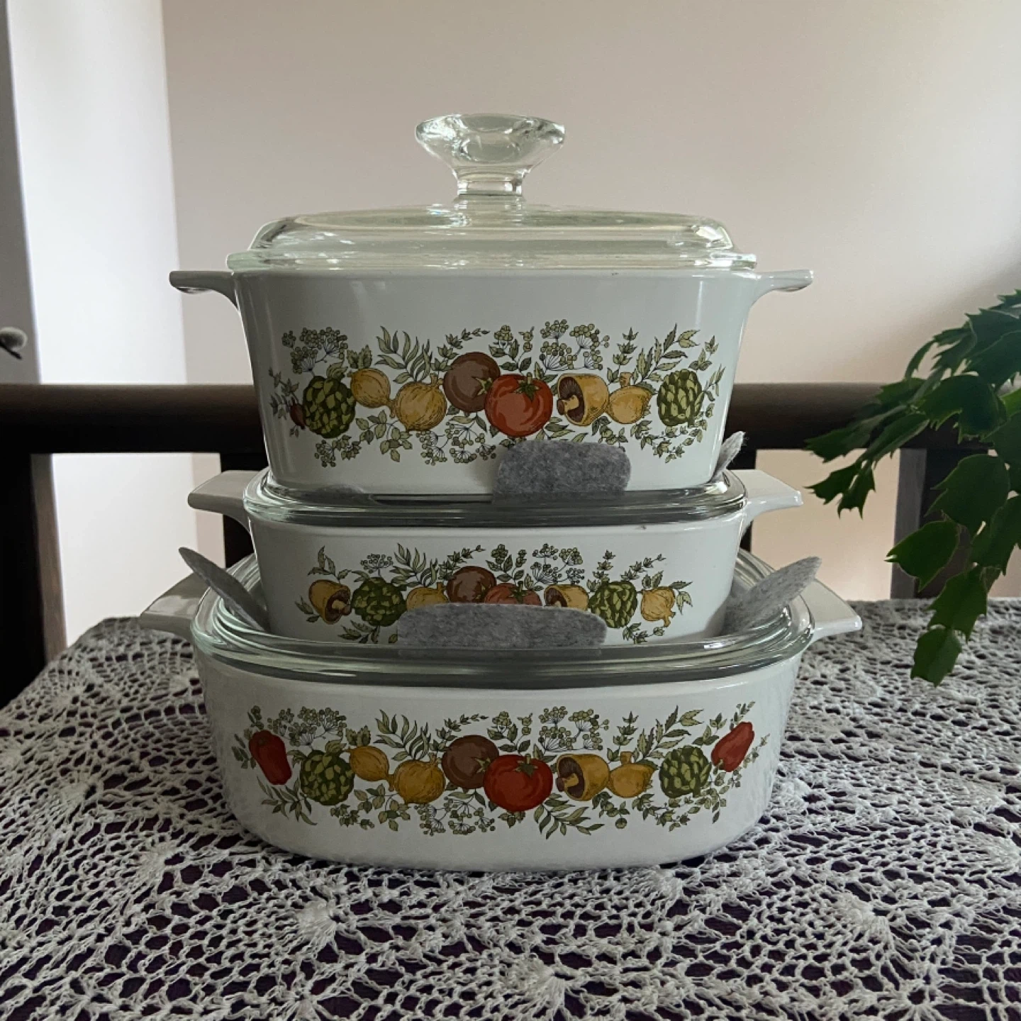 Selling a set of vintage Corning Ware casserole dishes (Spice of Life). Includes three different sized dishes with glass lids (1L, 2L, 4L) Great for cooking and serving! No chips, minimal wear.