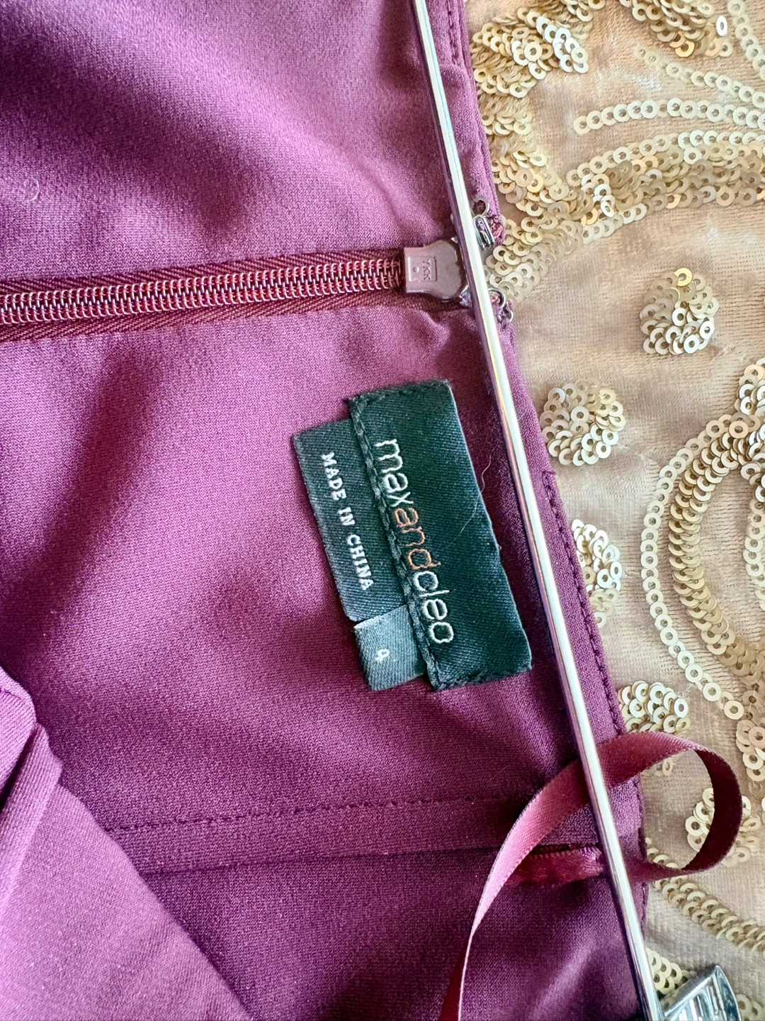 Selling a beautiful burgundy / purple full length dress from Max and Cleo! It's a size 4 and in perfect condition. The dress features a lovely design with a ribbon detail and some decorative stones. Worn once to a ball.