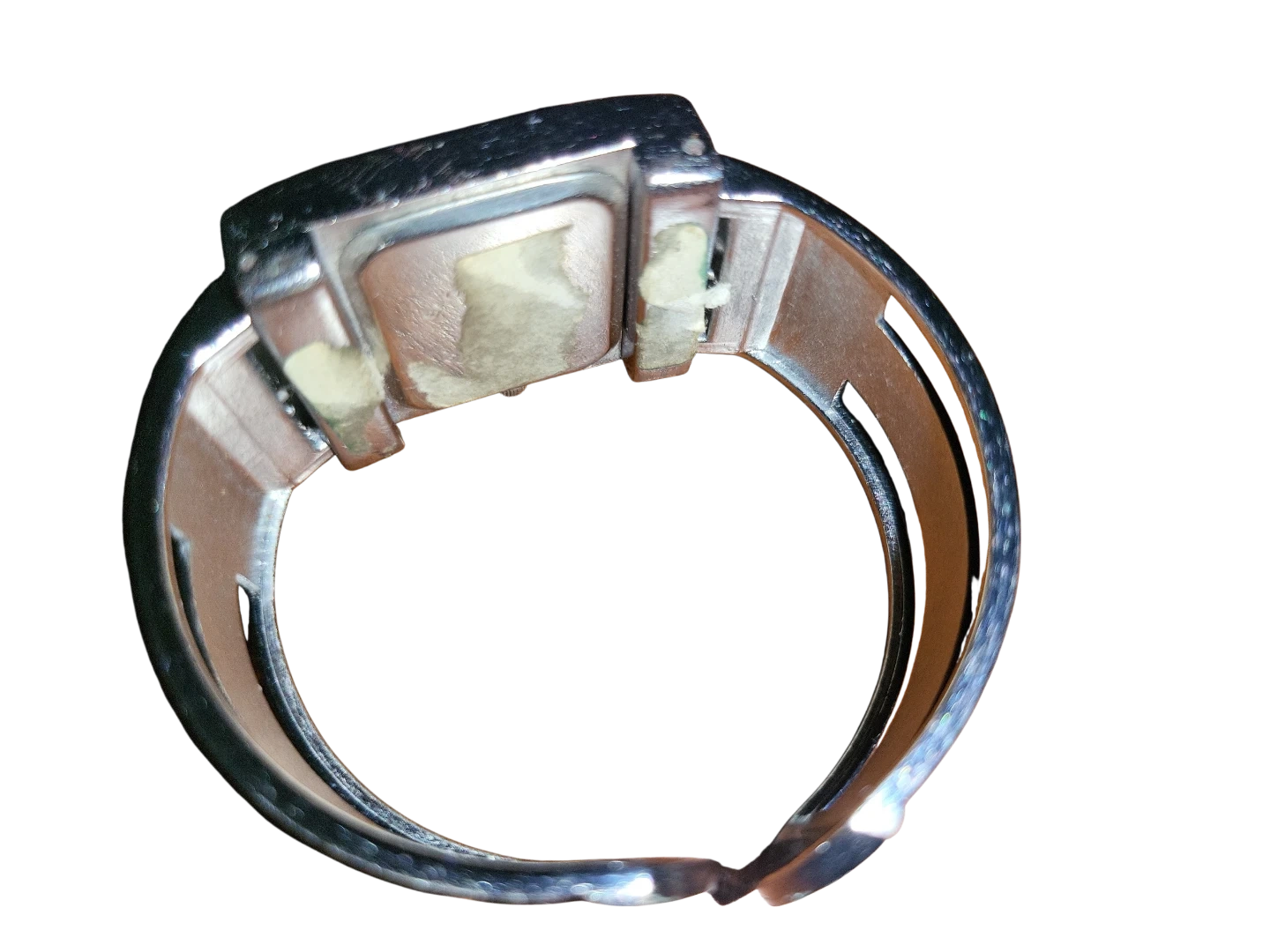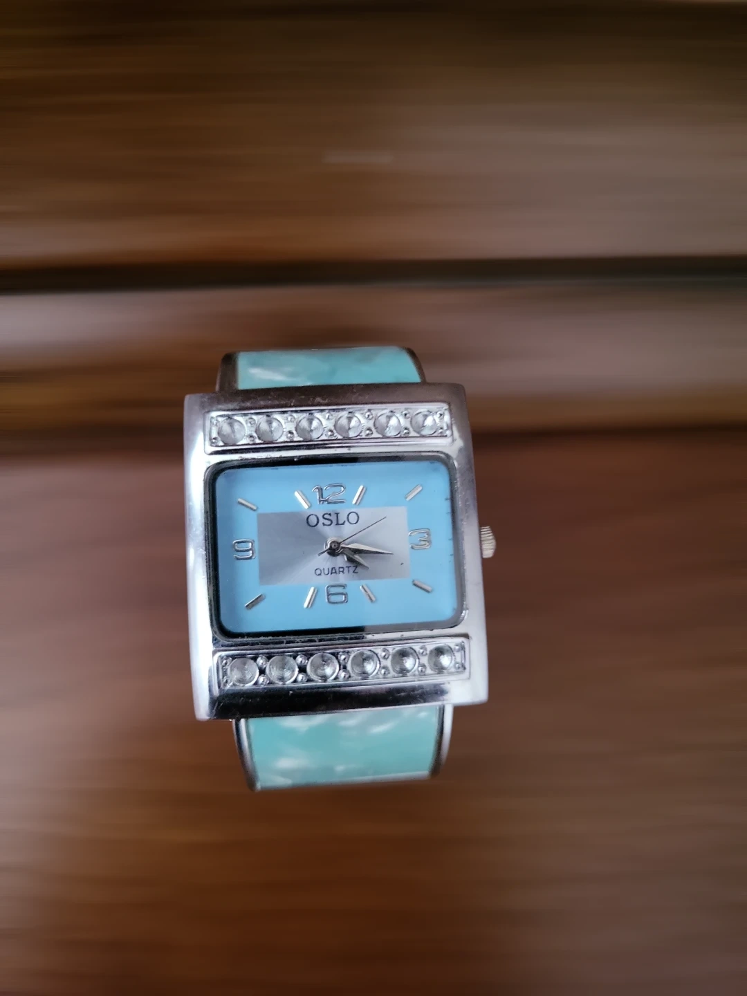 Here's a stylish Oslo quartz watch! It features a light blue face and decorative rhinestones. The band has a unique cuff design with a marbled turquoise accent.