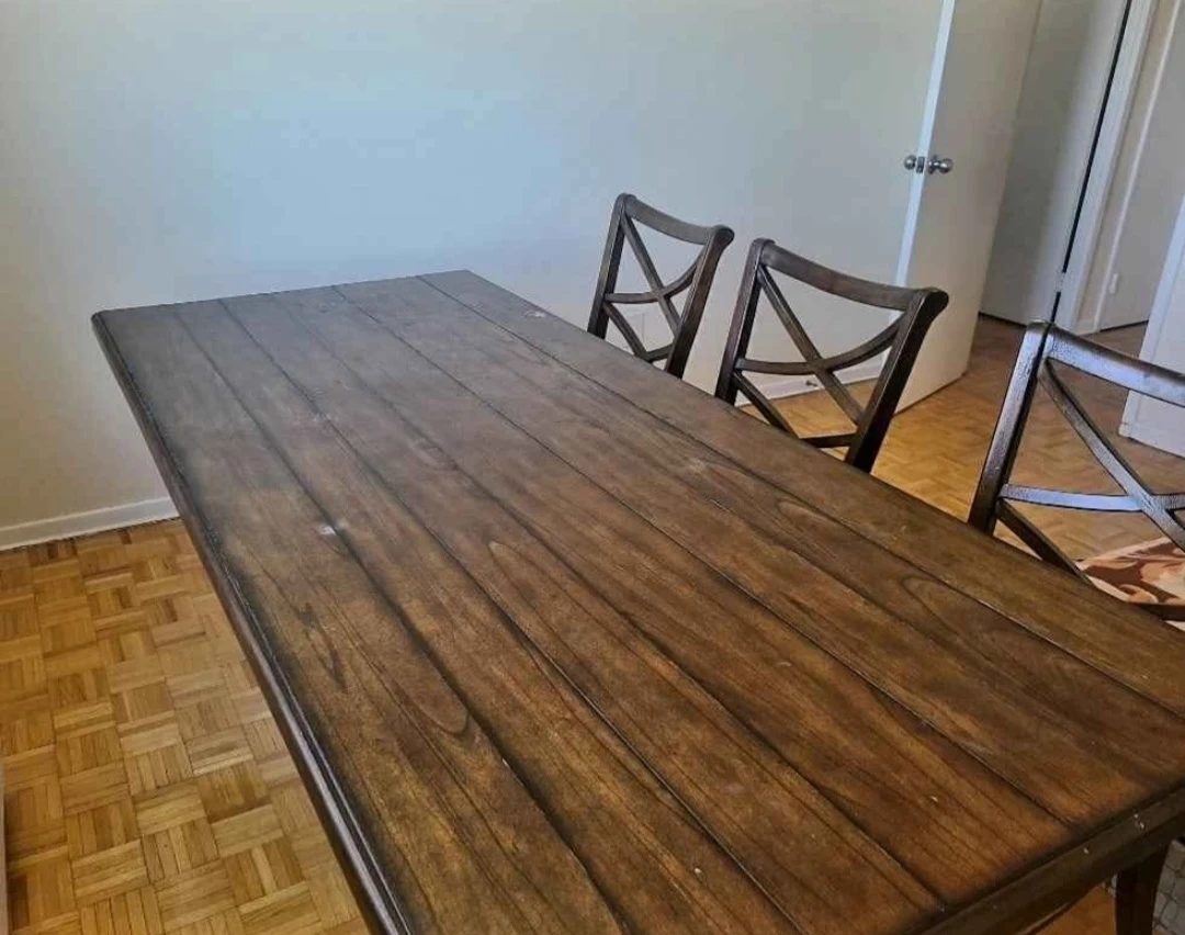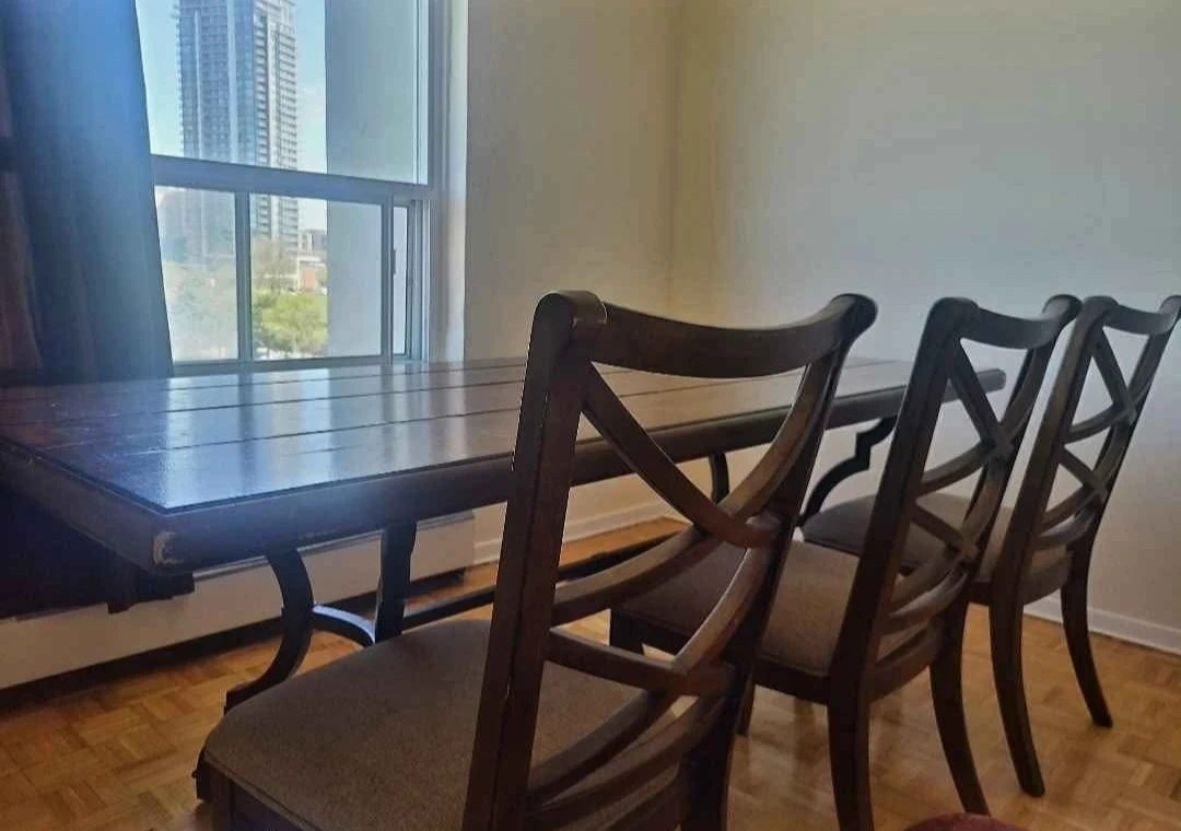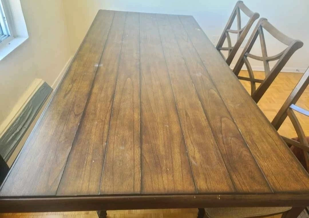 Selling our beautiful dark brown dining set as it won't fit in our new home. It has some visible wear on the edges, but is still in good condition for everyday use. This is a big solid table with 6 chairs.Asking price: $250 or best offer!Local pickup only. Note that the table is heavy and requires a van or similar vehicle.